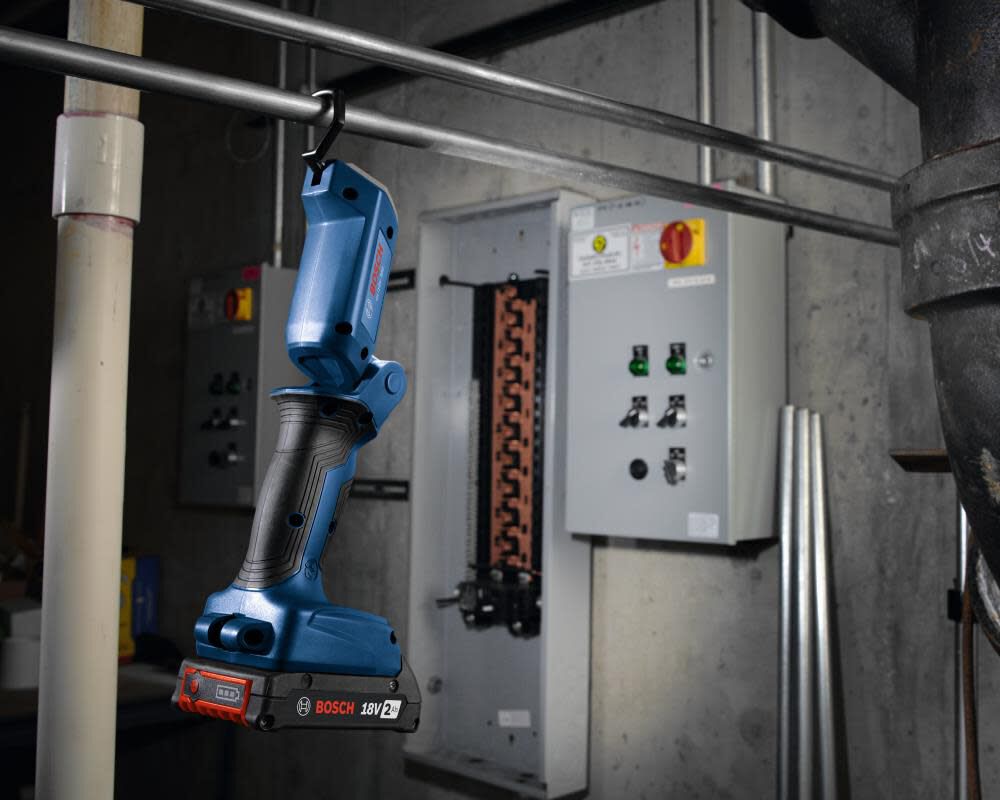 It provides 10 hours of illumination with a 2.0 Ah SlimPack battery (not included) for example – delivering 300 minutes of runtime for every Amp hour (Ah) that the Bosch 18 V battery provides.