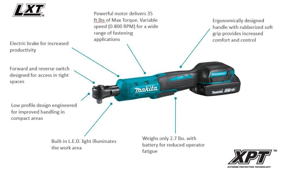 When the motor is not engaged, the ratchet can be used manually. ItÄôs part of MakitaÄôs expanding 18V LXT System, the worldÄôs largest cordless tool system powered by 18V lithium-ion slide-style batteries.