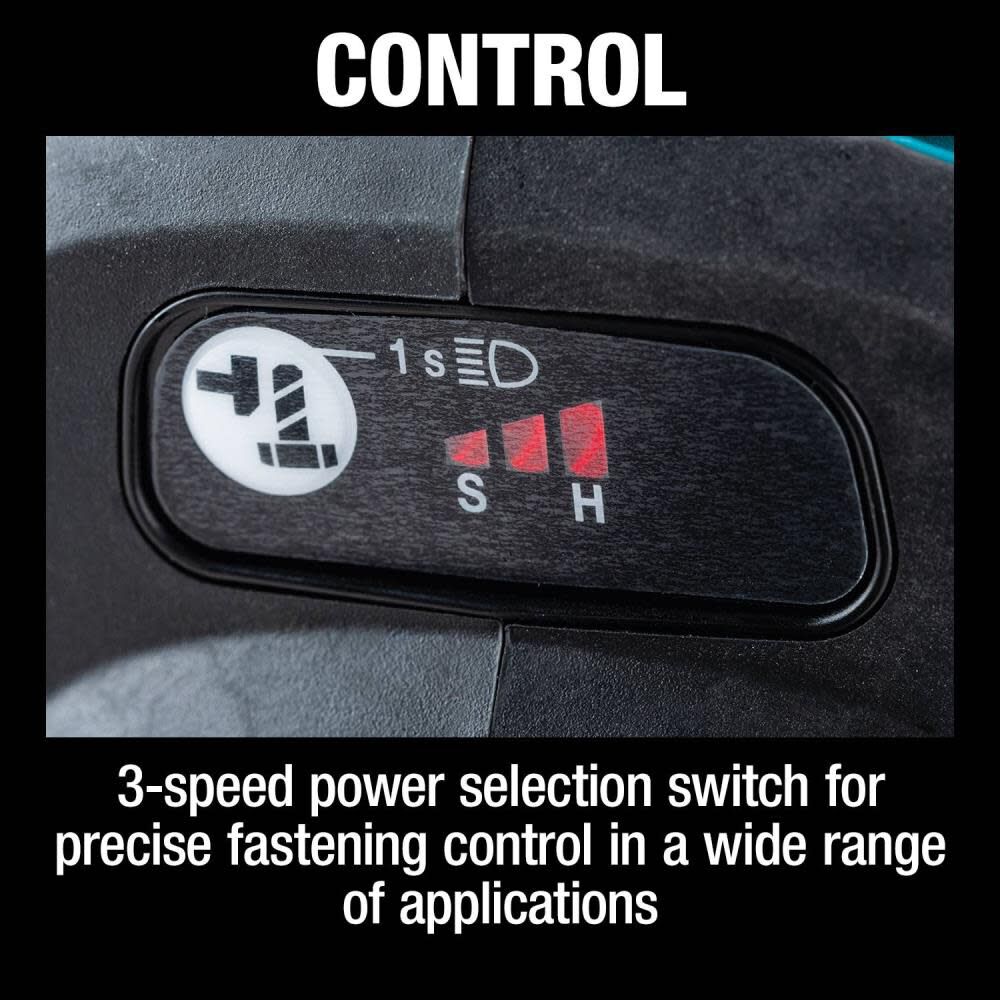 - 3-speed power selection switch (0-900 / 0-1,000 / 0-2,000 RPM & 0-1,800 / 0-2,000 / 0-2,400 IPM) for precise fastening control in a wide range of applications