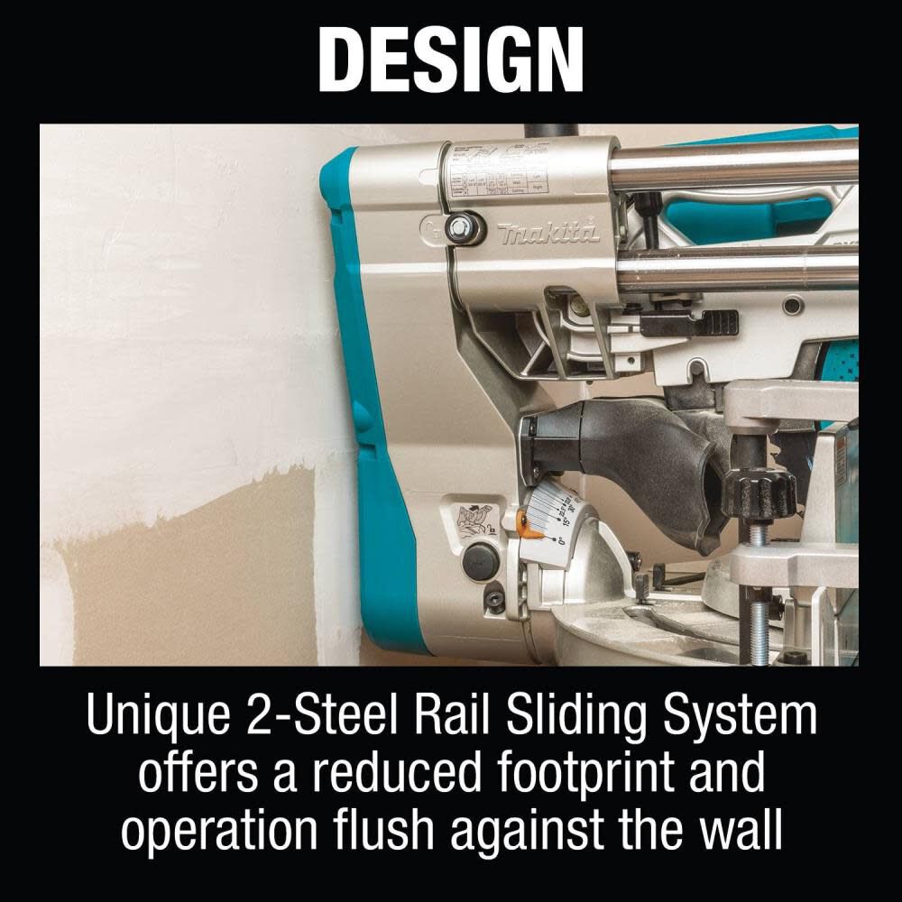 Miter saw features unique 2-steel rail sliding system to facilitate single slide-glide operation, where as the reduced saw footprint allows operation flush against a wall.