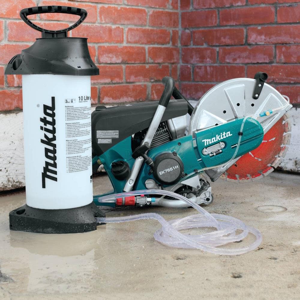 The Makita 2.6 Gallon pressurized water tank is designed to be used with gas power cuts while making cuts in masonry materials with a wet use diamond blade.
