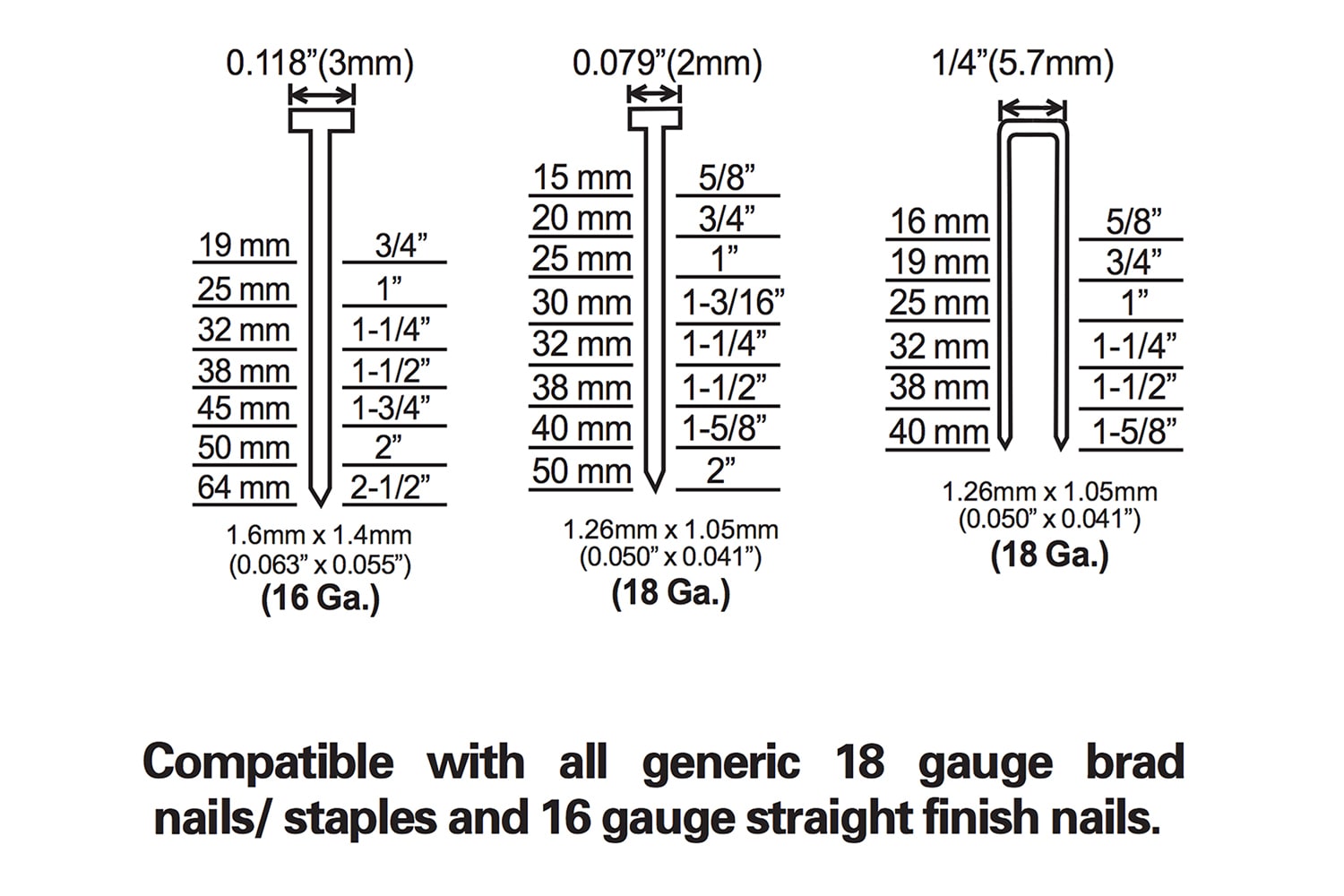 Drives 16-Gauge finish nails from 3/4 in to 1-1/2 in long, 18-Gauge brad nails from 5/8 in to 2 in long and 18-Gauge narrow crown staples from 5/8 in to 1-5/8 in long