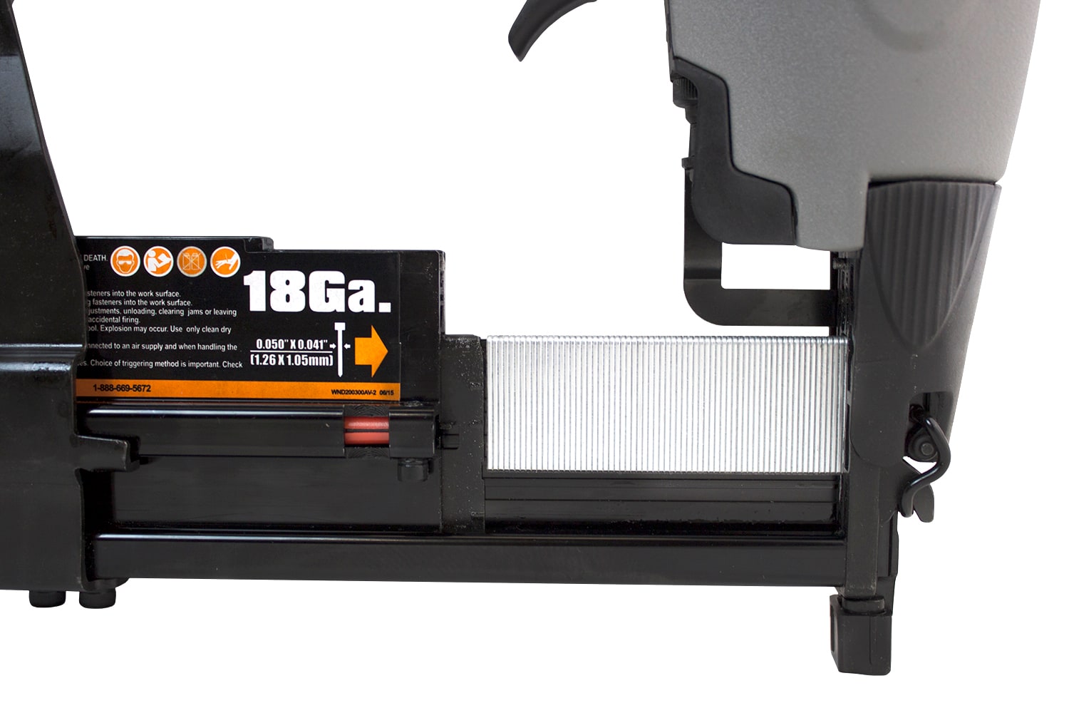 This nail gun features a no mar tip that protects your work surface from damage, 360 degree adjustable exhaust that keeps air, dust, and debris out of your workspace, and a reload indicator to make it easy to see when you are running low on fasteners