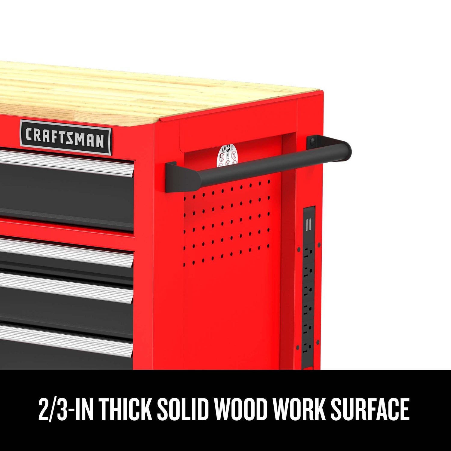 The butcher block top provides a heavy-duty work surface while the power strip keeps all your CRAFTSMAN power tools charged and ready to use.