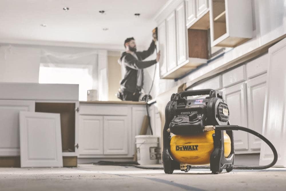 The DeWalt brushless cordless air compressor has a lightweight construction and the heavy-duty roll cage design safeguards the contents of the compressor.