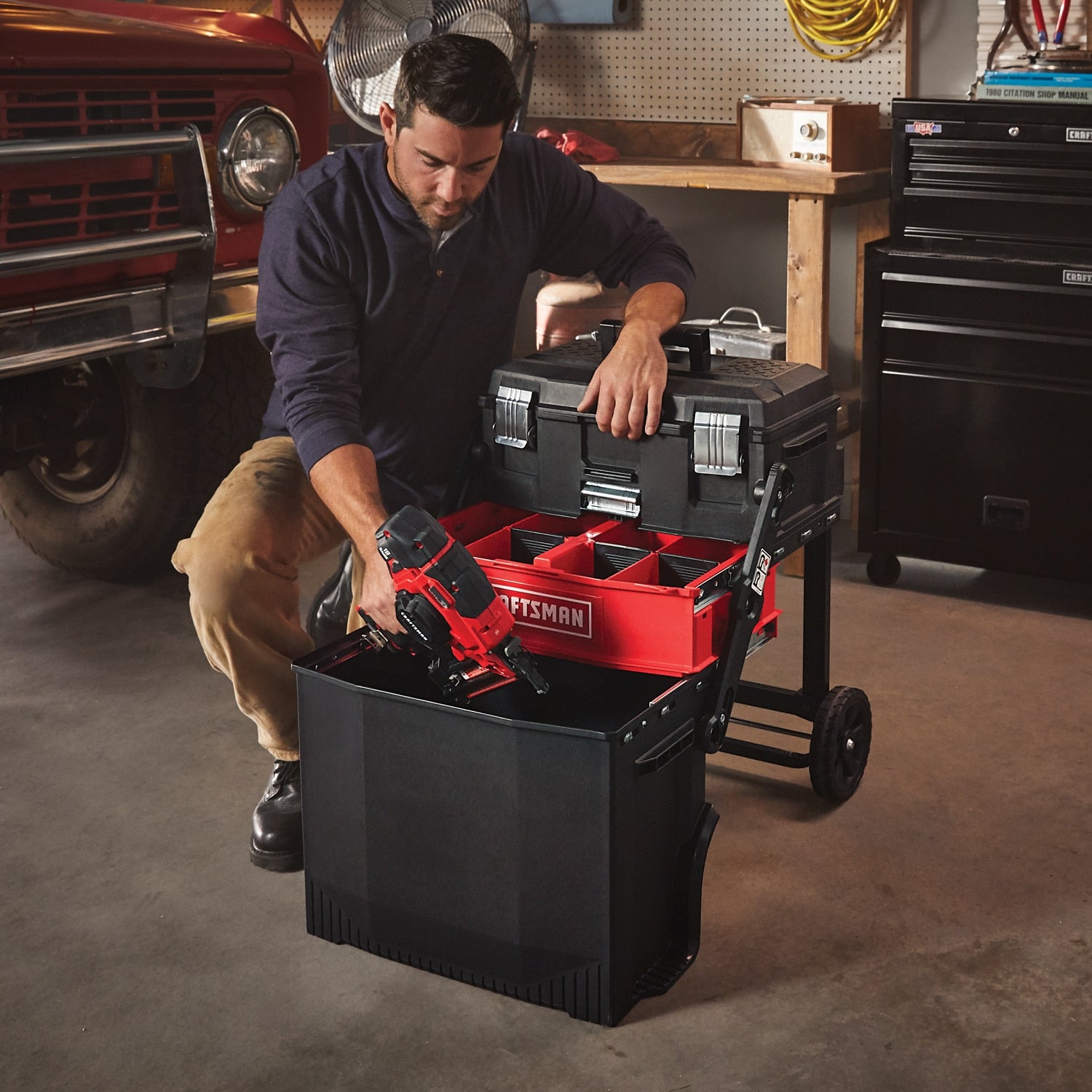 In one seamless movement users can open and extend the workshop for visible access to four levels of storage.