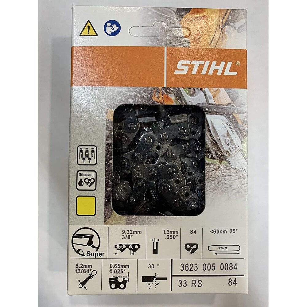 Stihl chain is also pre-stretched at the factory, which helps eliminate excess adjustments during break in periods. 33RS is part of the Stihl Rapid Super series. 33RS is a fast cutting chisel chain which work best in clean cutting conditions, where there is limited contact with dirt and other abrasive materials.
