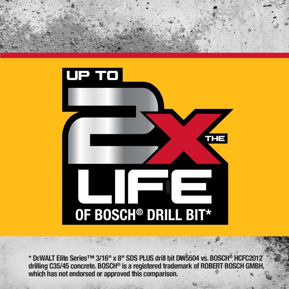 With up to twice the life of BOSCH you can drill through hard concrete and withstand rebar strikes with the DEWALT ELITE SERIES SDS PLUS Drill Bit 3/16Äù x 8Äù.