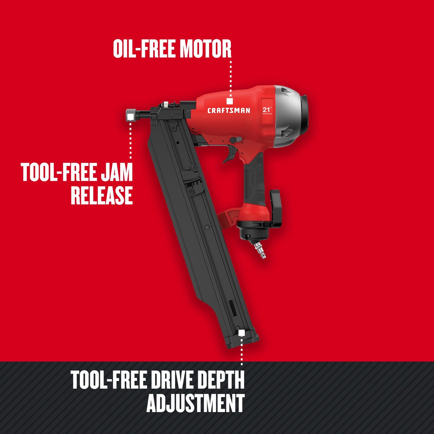 PROPER ADJUSTMENT: Tool-free depth-of-drive adjustment for proper setting of nail heads