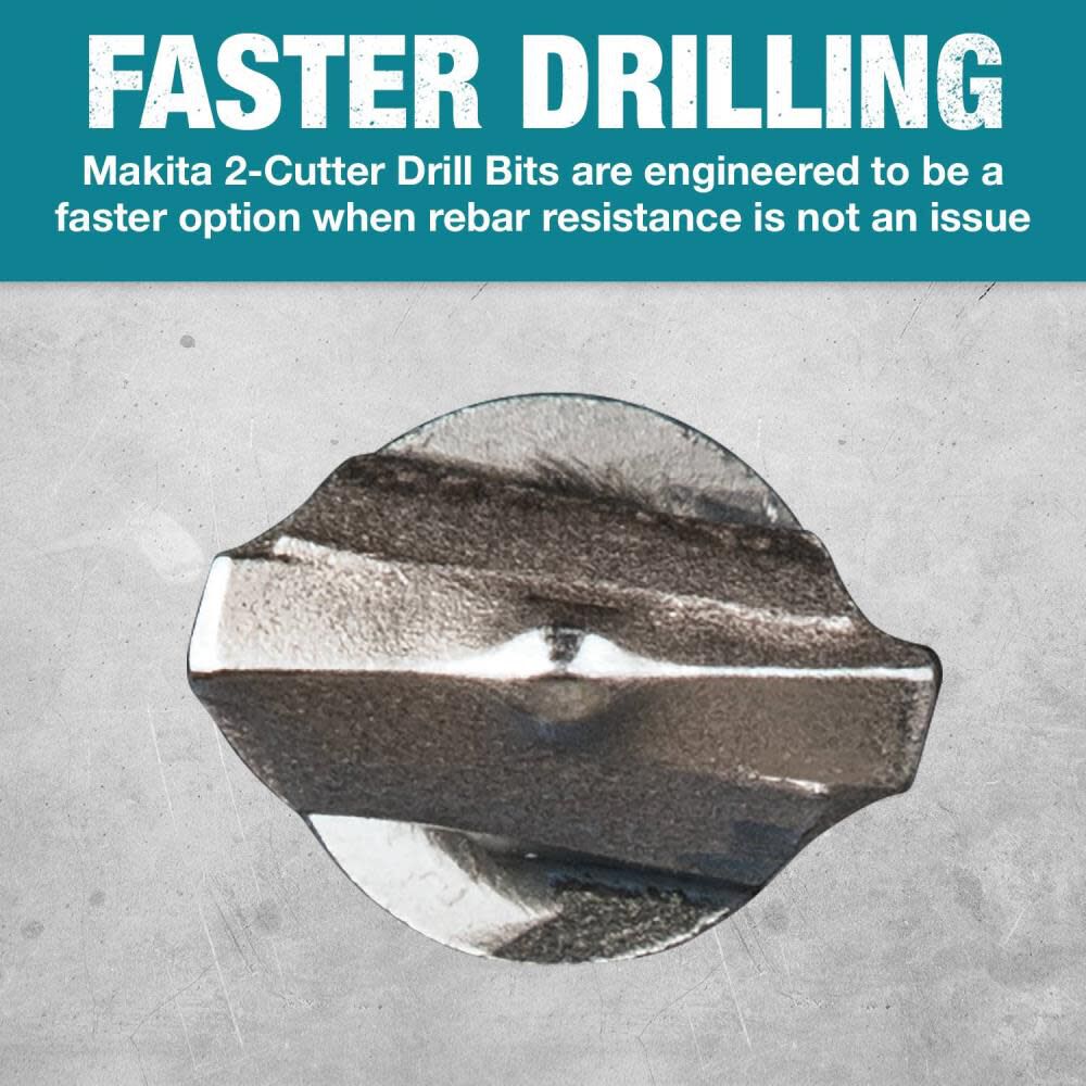 Makita spline 2-cutter bits feature premium carbide tips for efficient drilling and longer service life, with a special flute design that is engineered for faster dust removal than standard bits.