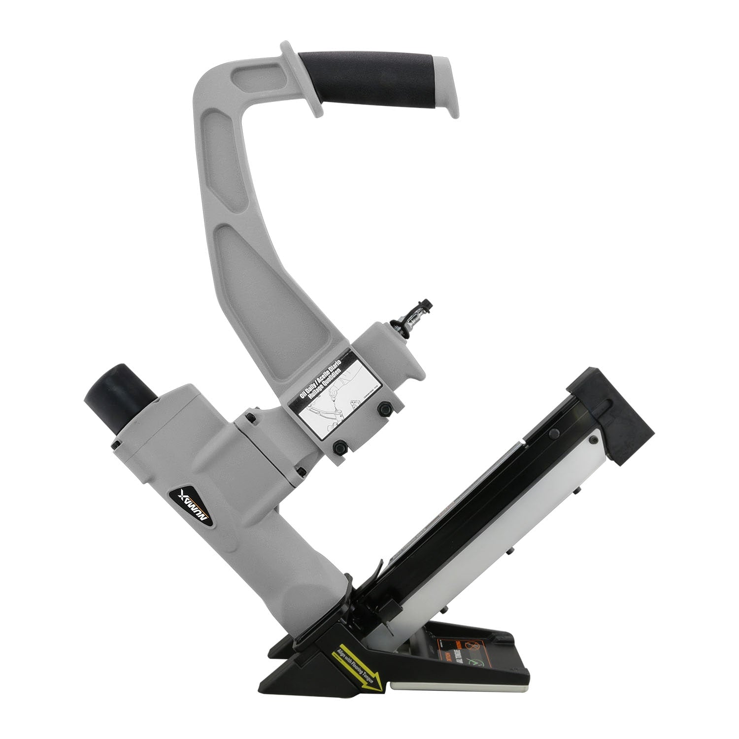 This air powered flooring nail gun and stapler is compatible with 16-Gauge T-cleats and L-cleats and 15.5-Gauge 1/2 in.