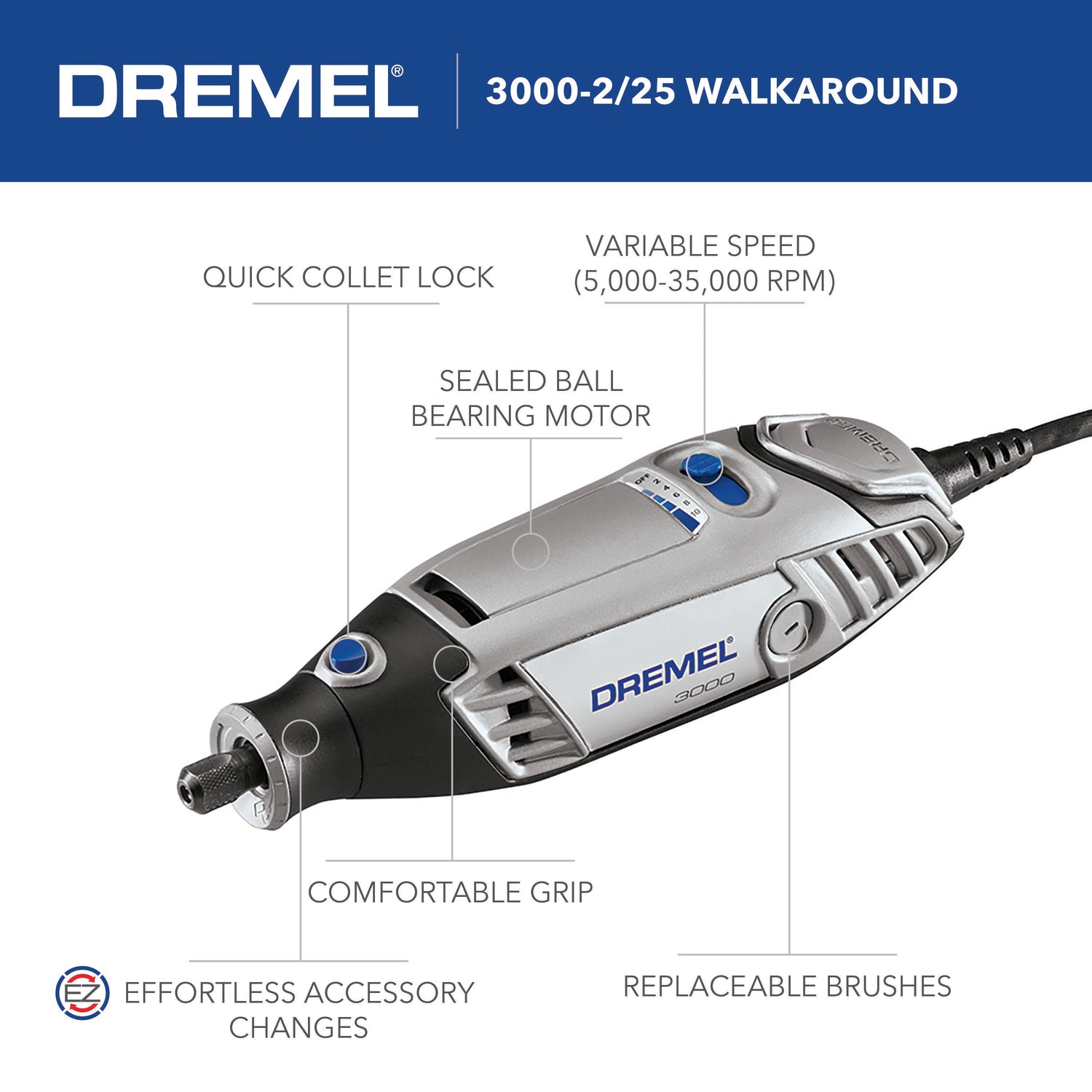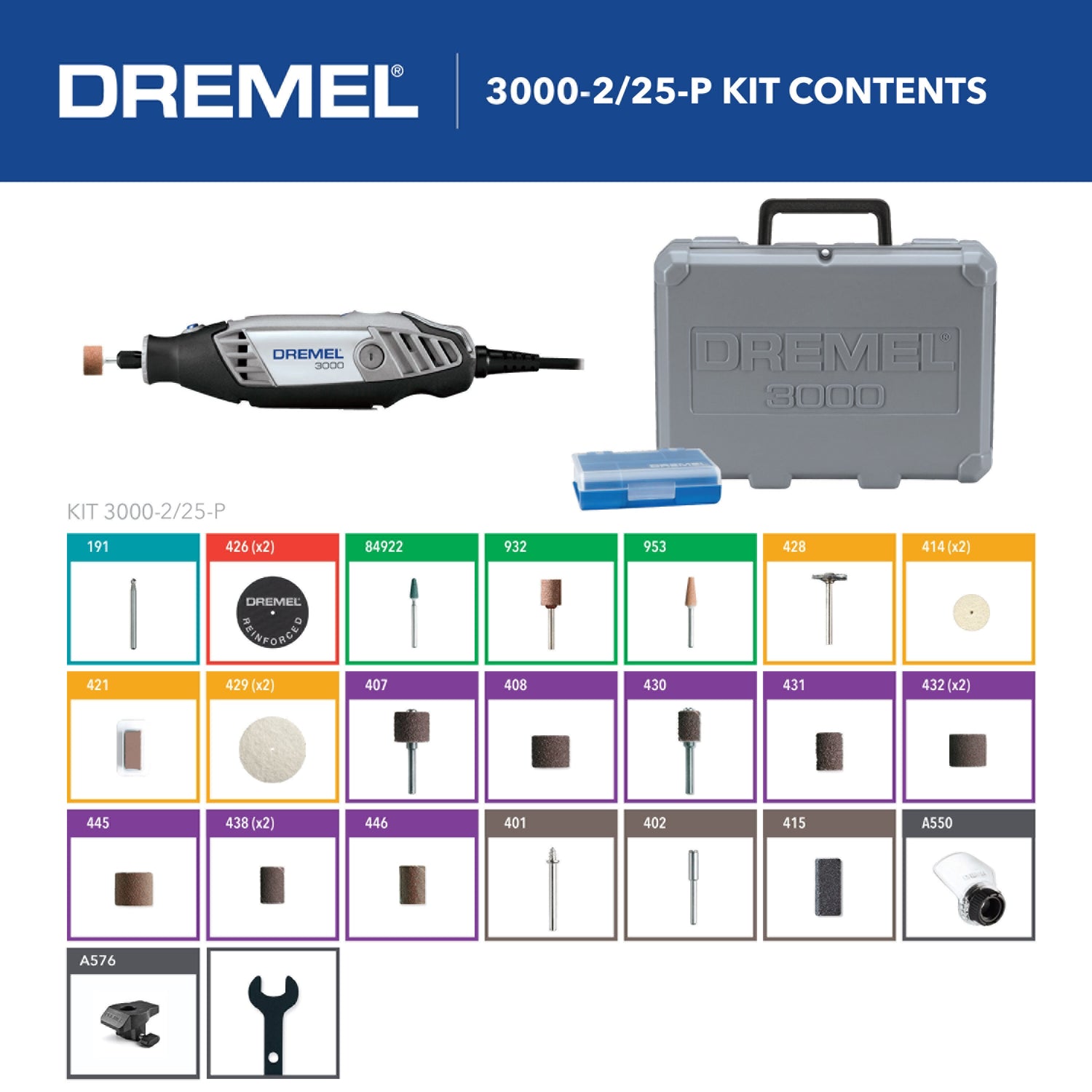 VERSATILE ROTARY TOOL KIT: includes Dremel 3000 corded rotary tool, 1 attachment, 25 high-quality Dremel accessories, plastic storage case, and accessory case.