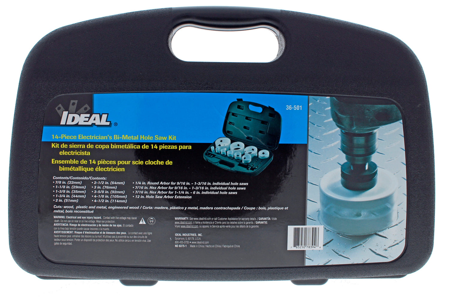 Kit contains: 7/8, 1-1/8, 1-3/8, 1-3/4, 2, 2-1/2, 3, 3-5/8, 4-1/8, 4-1/2 in hole saws, 36-570, 36-572 arbor, 36-573 arbor, 12 in extension