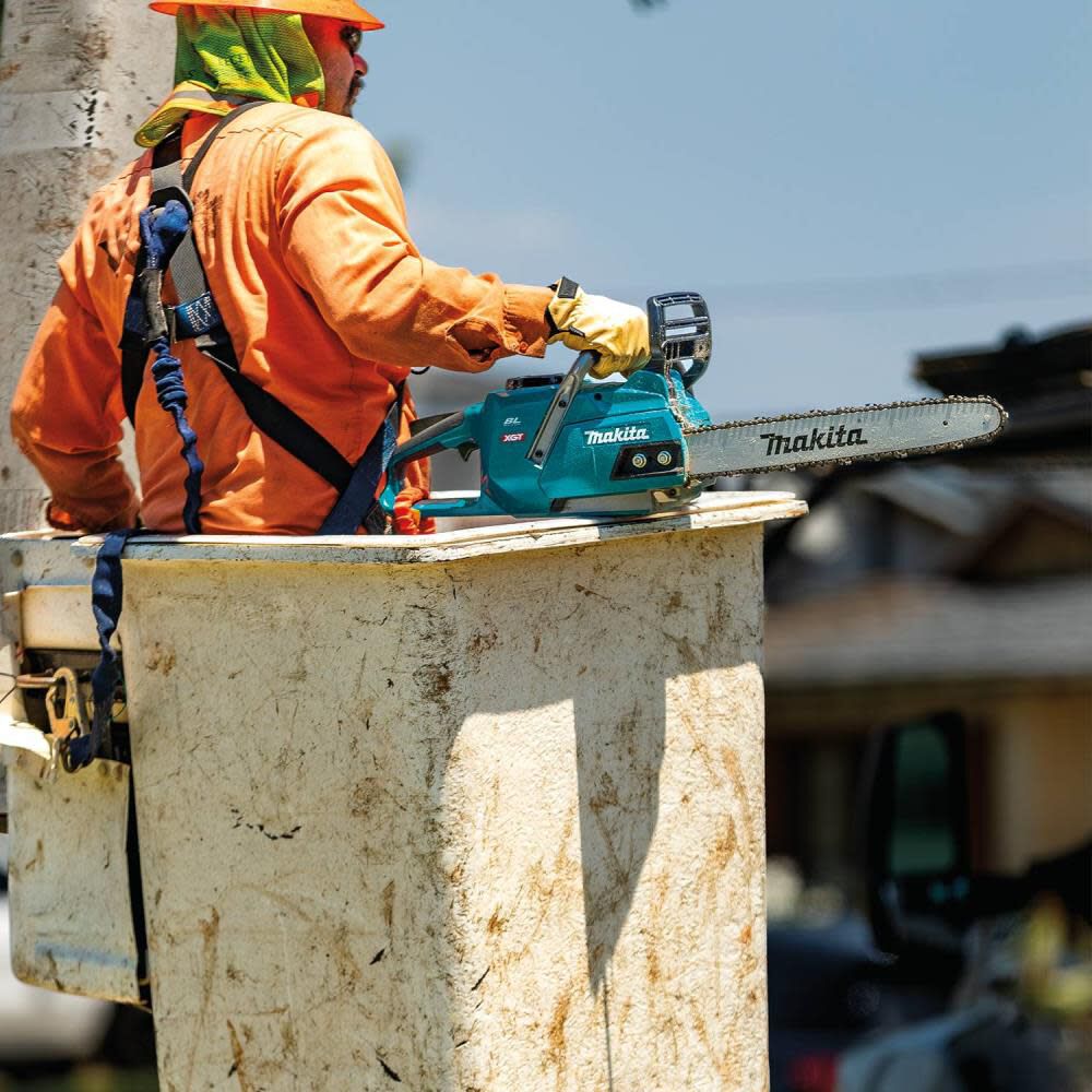 The Makita cordless 18 Inch chain saw kit contains a 18 Inch chain saw, 40 Volt max XGTÆ lithium-ion 5 Amp-Hours battery, rapid charger and 18 Inch sprocket nose guide bar.