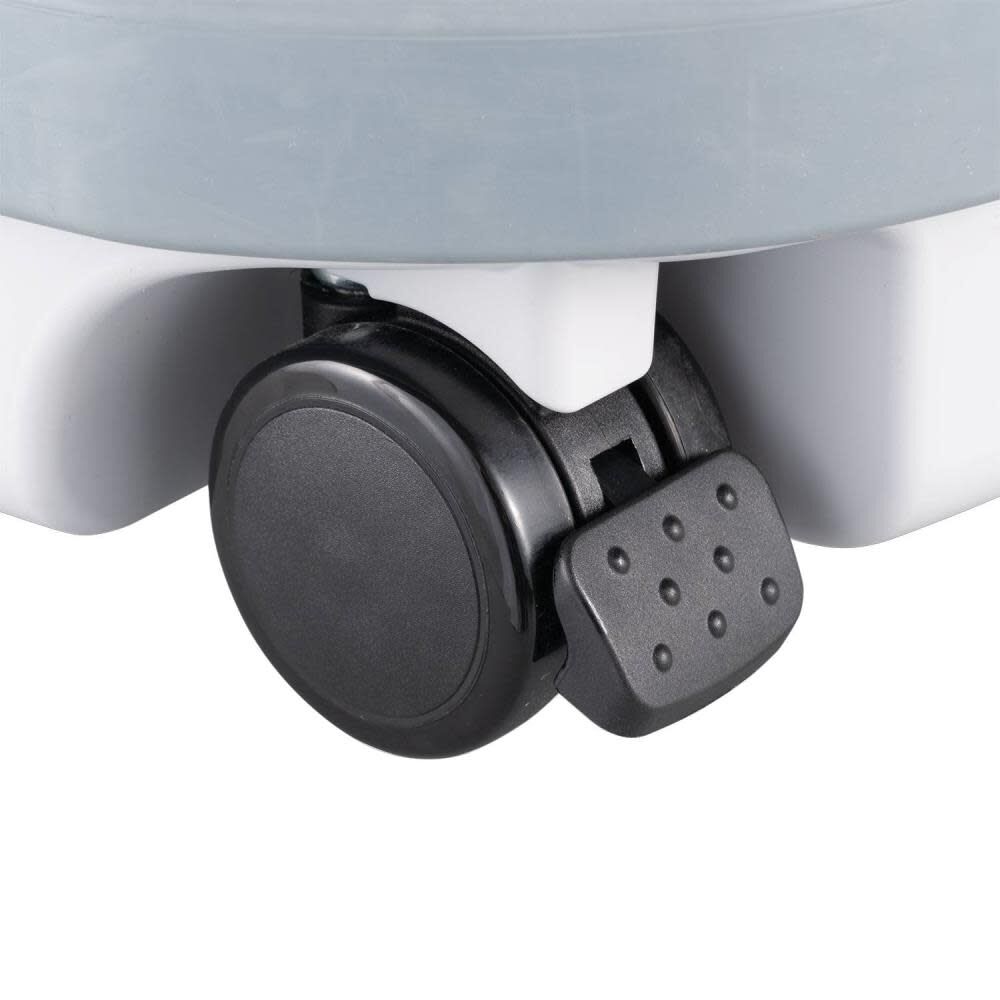 Convenience features include four rotating wheels for 360-degree mobility, rear casters with locking levers, and a large rubber bumper to help prevent damage to the work environment.