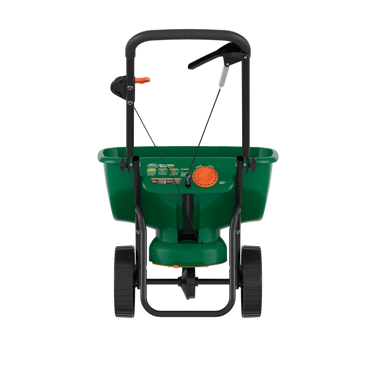 To begin, turn rate control dial to the correct setting listed on the back of each Scotts® product, pour the product in the hopper, then start spreading.
