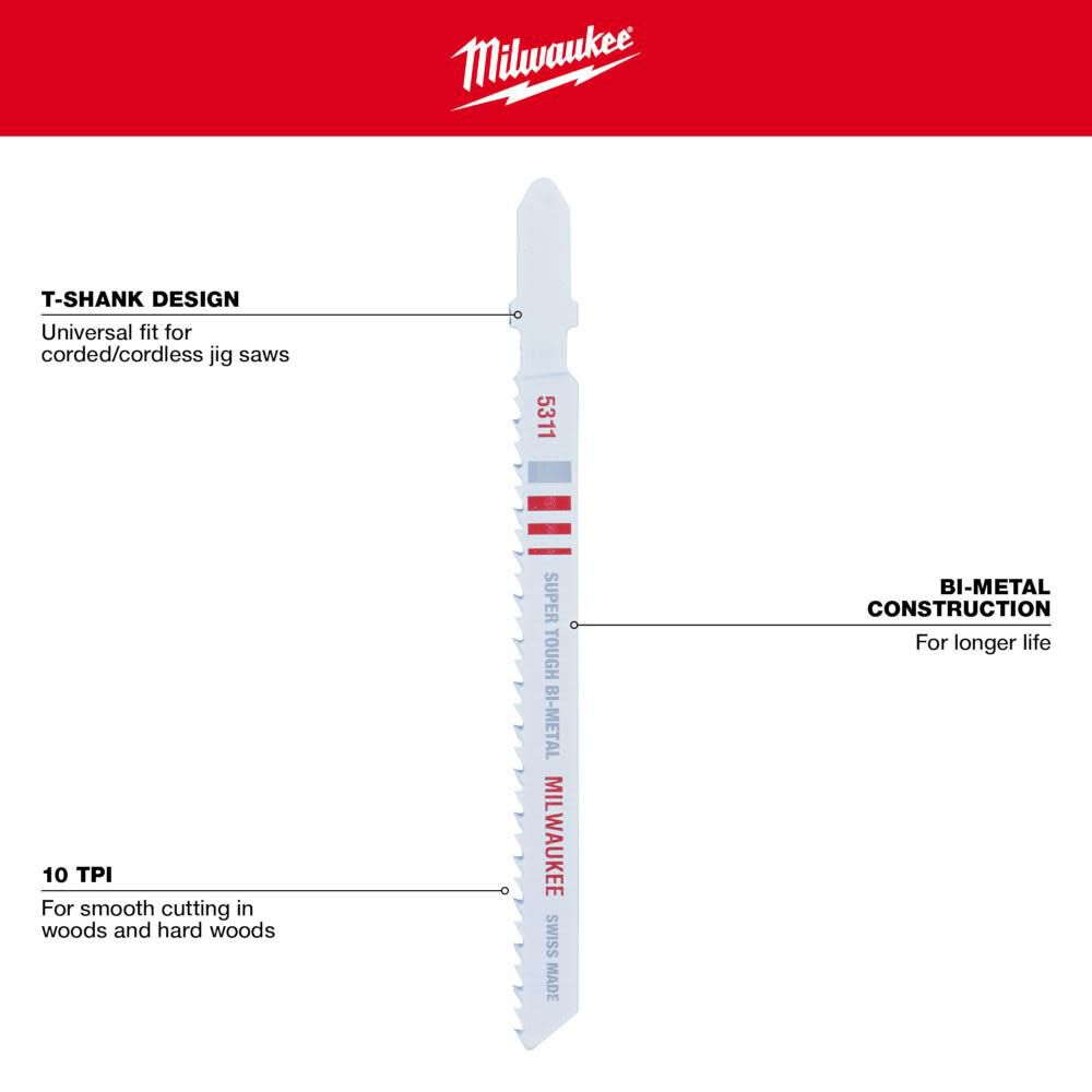 Milwaukee 4in 10TPI T-Shank Wood Bi-Metal Jigsaw Blades 5pk