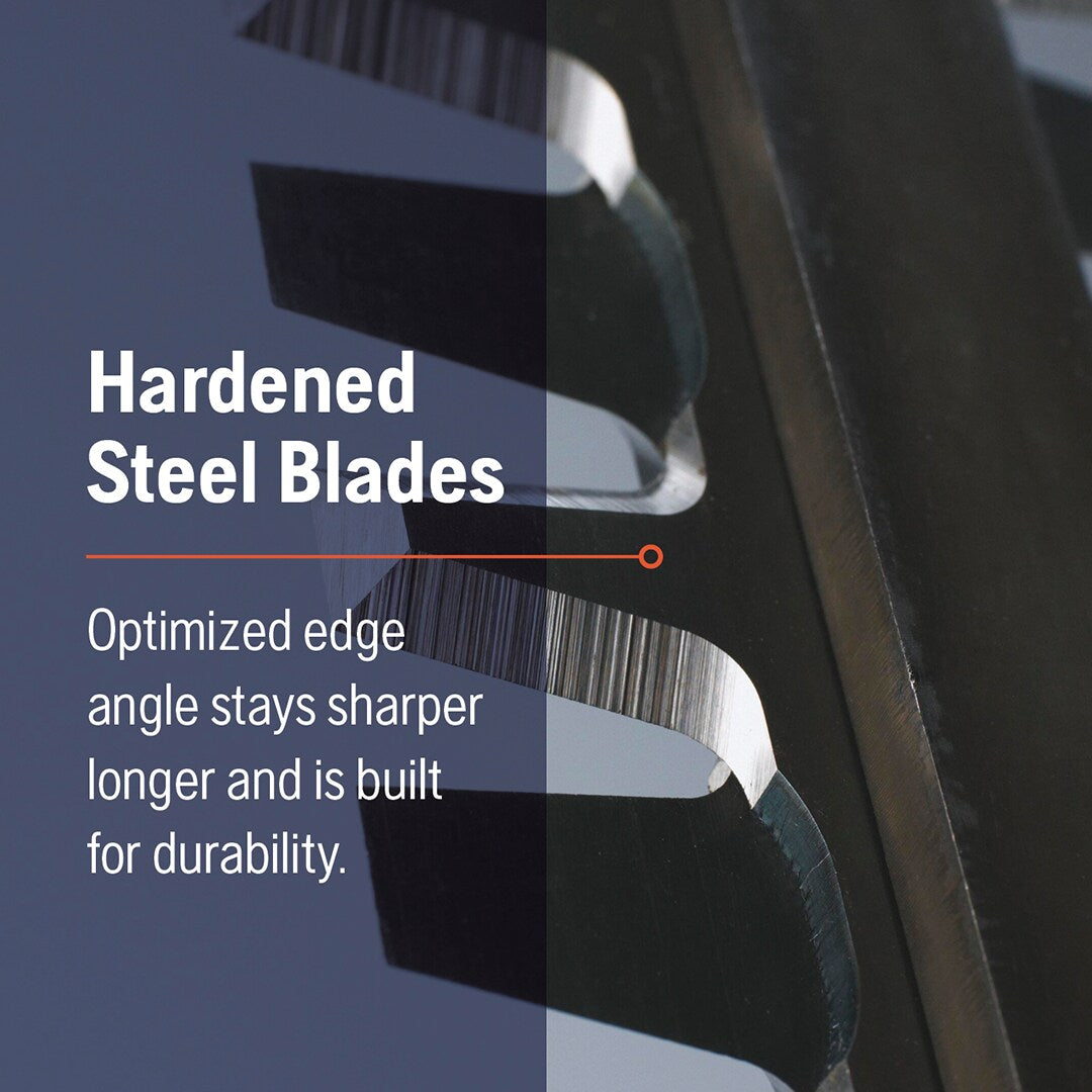 Long 26 in stainless steel, dual-action blade cuts in either direction, allowing you to work more efficiently