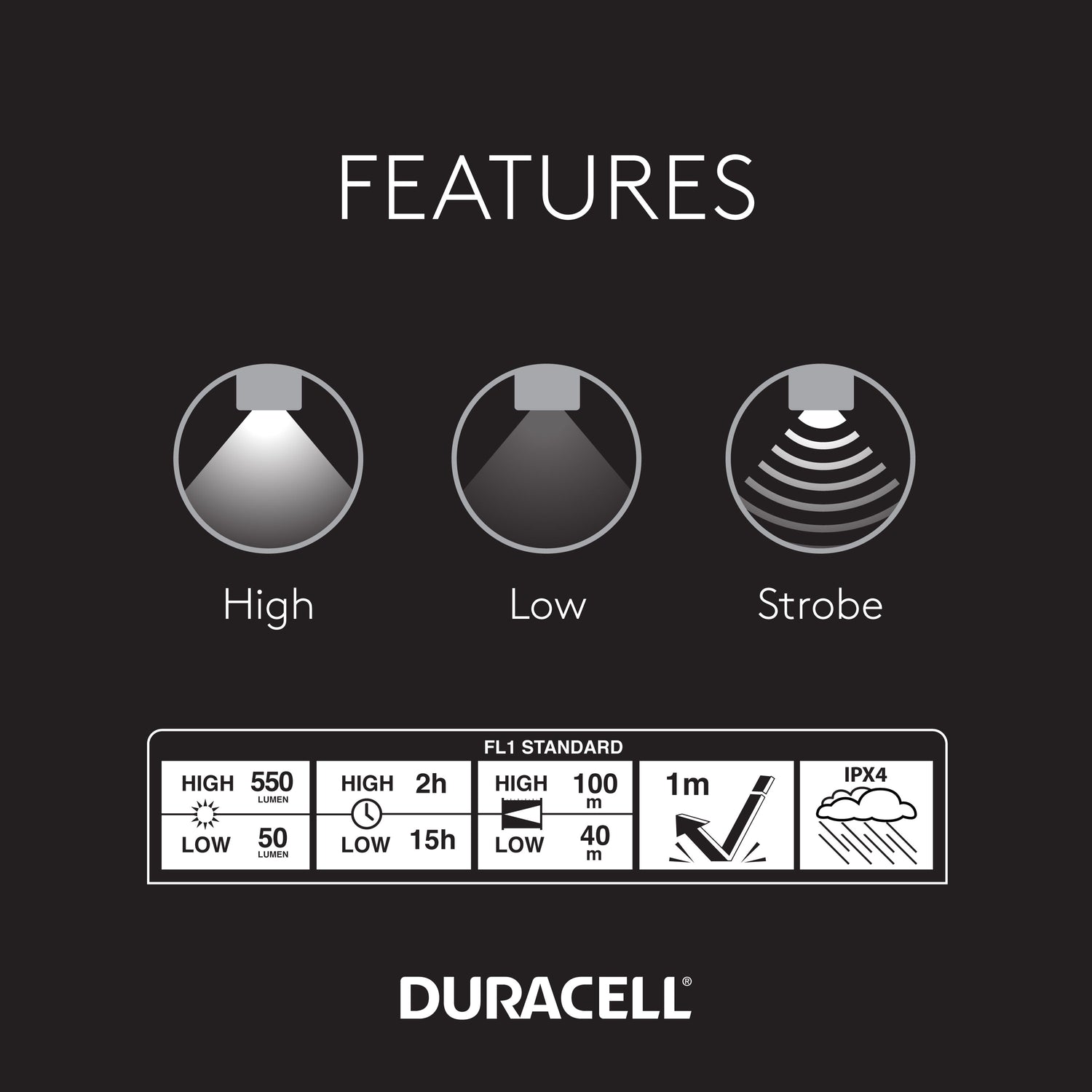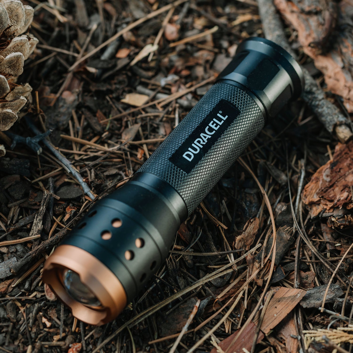 Duracell's powerful 550 Lumen copper dot focusing Flashlight allows you to transition seamlessly between wide and narrow in one easy swipe, use the narrow beam for long-distance observation and the wide beam for large-scale lighting