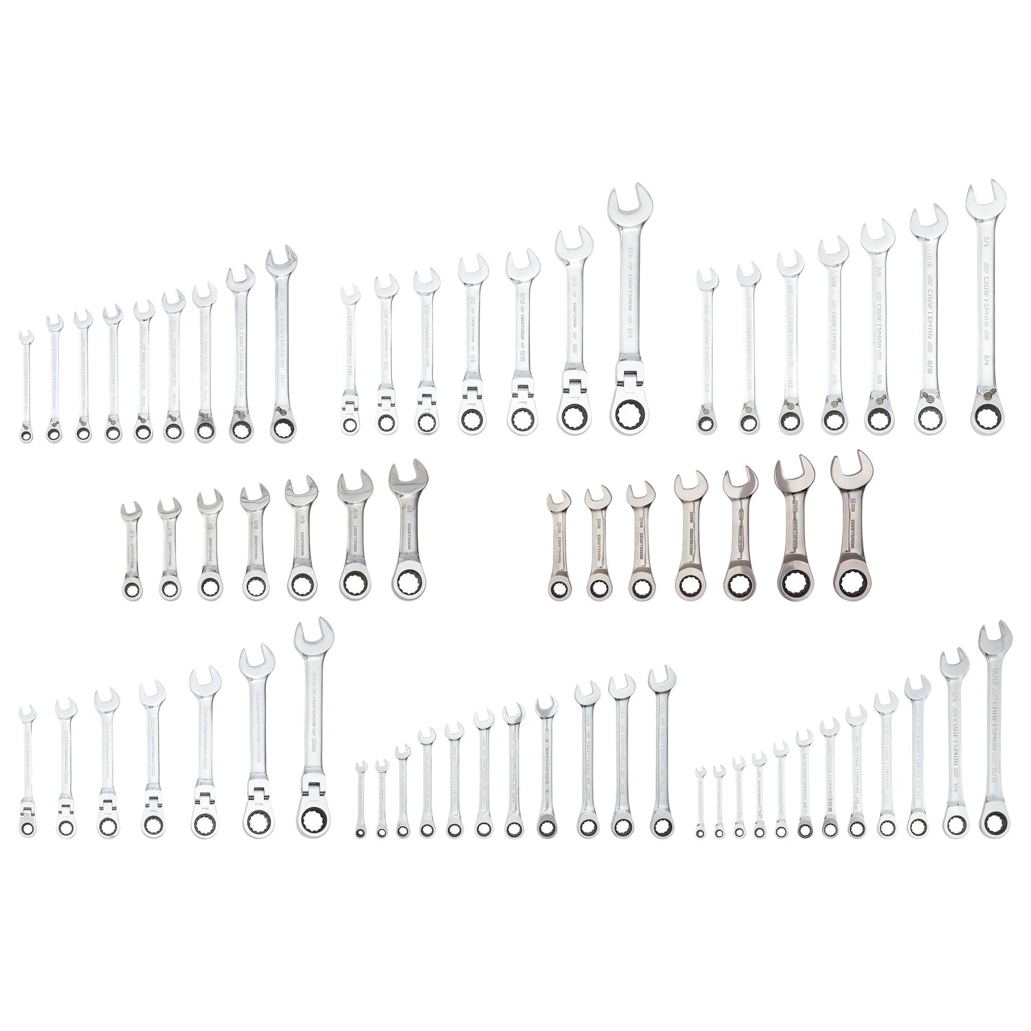 Included are 23 Ratcheting Combination Wrenches, 14 Flex Head Ratcheting Wrenches, 16 Reversible Ratcheting Combination Wrenches, and 14 Stubby Ratcheting Combination Wrenches.