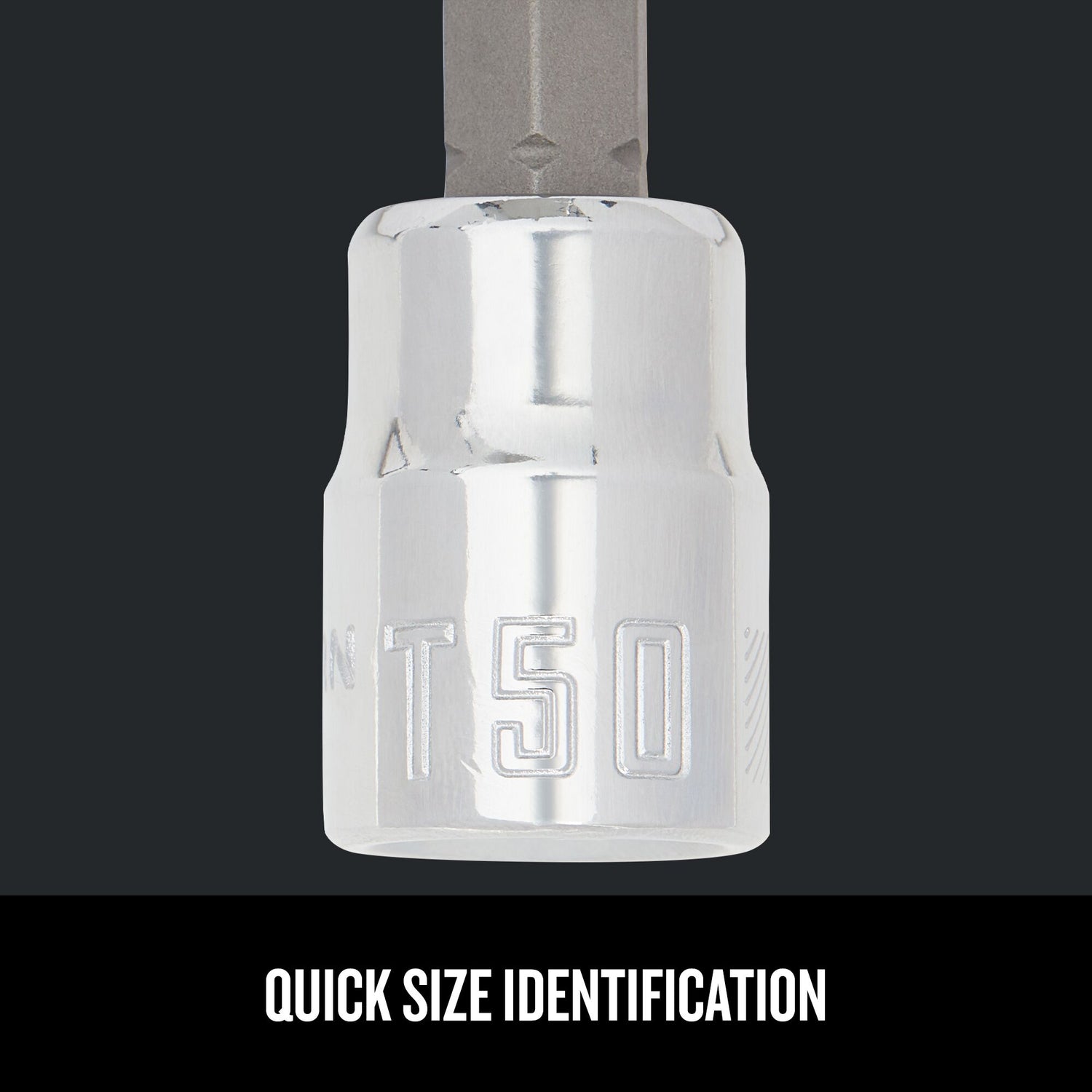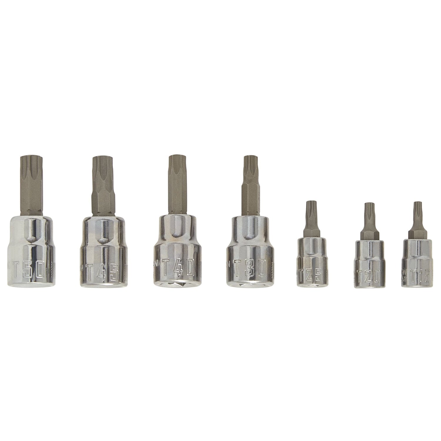 Includes (3) 1/4-in Drive Torx Bit Sockets (T15, T20, T25) and (4) 3/8-in Drive Torx Bit Sockets (T30, T40, T45, T50)