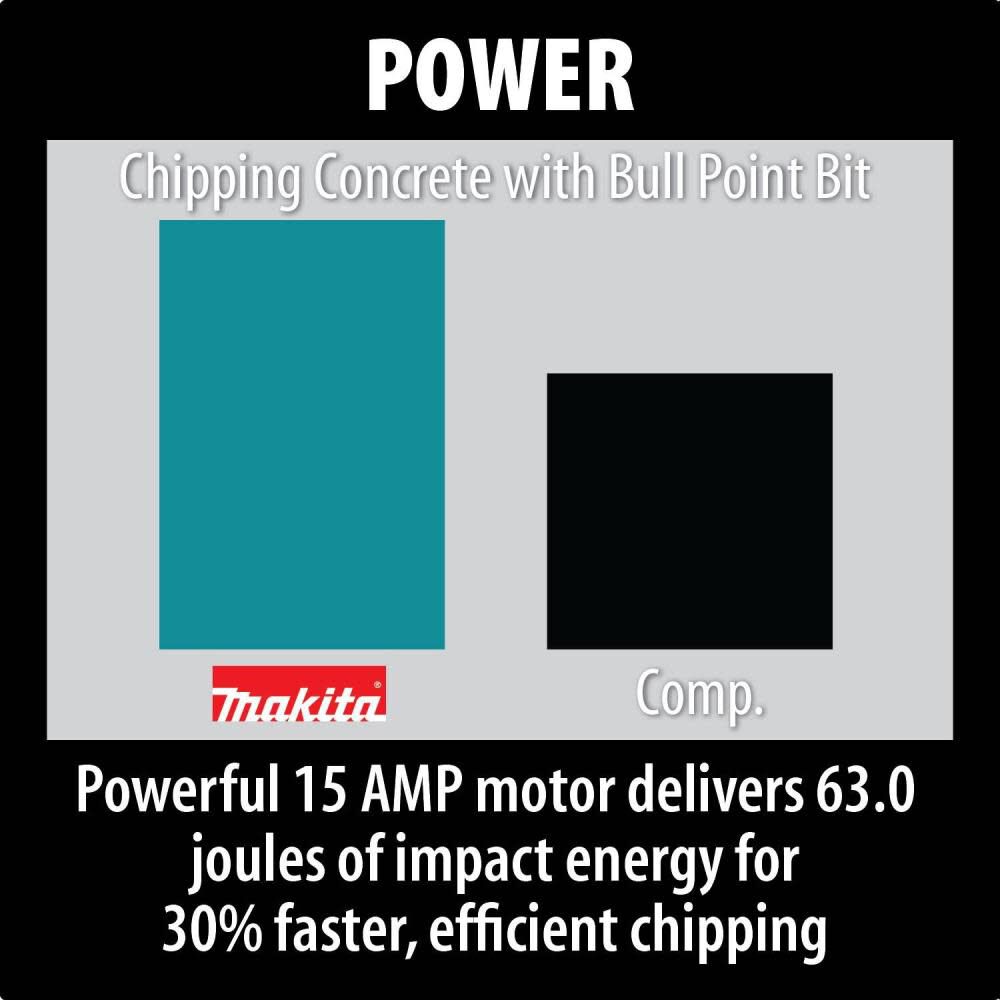 The Makita AVT 70 lb breaker hammer is powered by a powerful 15 Amp motor that delivers up to 46.5 ft-lb of impact energy for most demanding applications.