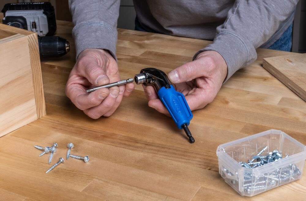 This compact drill attachment allows you to drive screws in places you couldnÄôt normally reach with your drill.