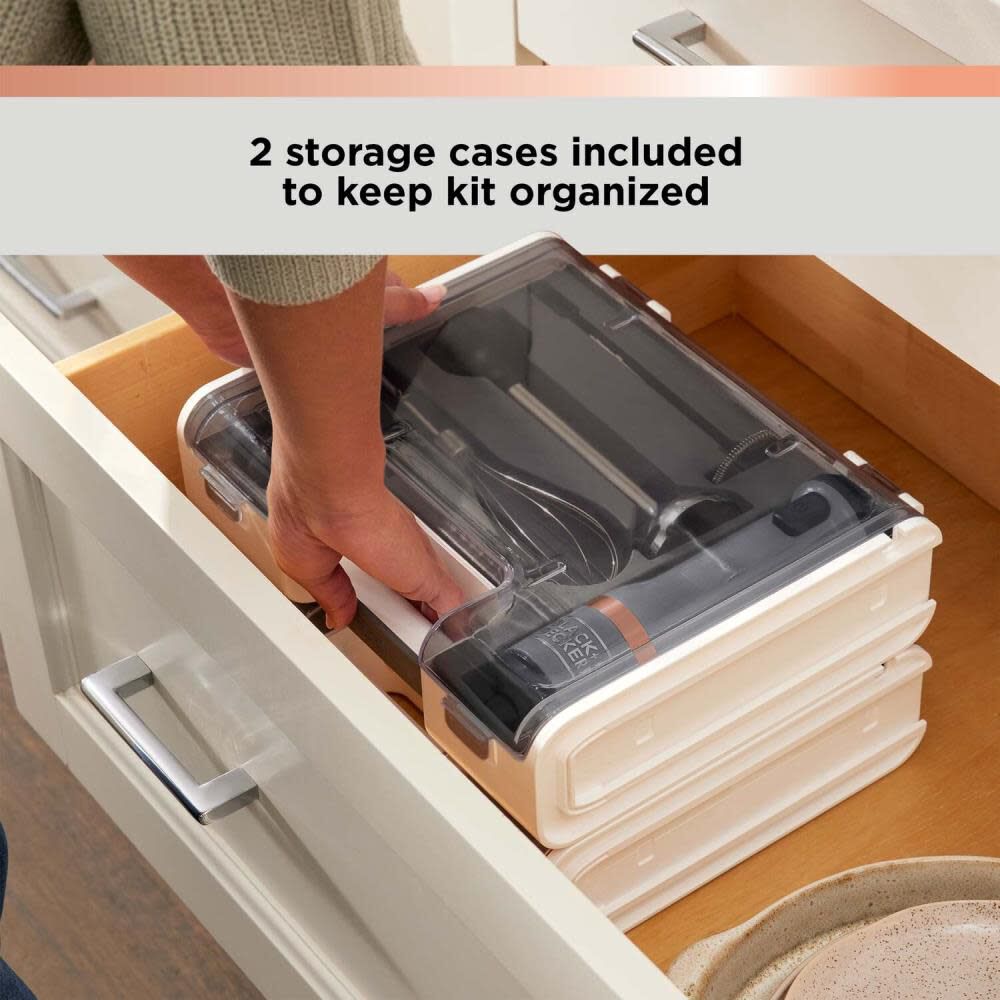 The kit also includes a measuring cup and lid, 2 storage cases with insert trays, and a charging dock and cord to minimize the amount of space kitchen wand takes in your kitchen.