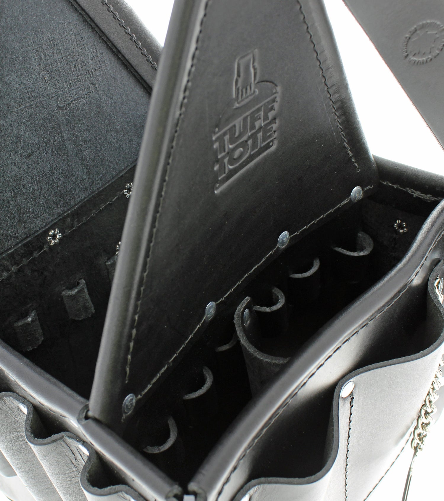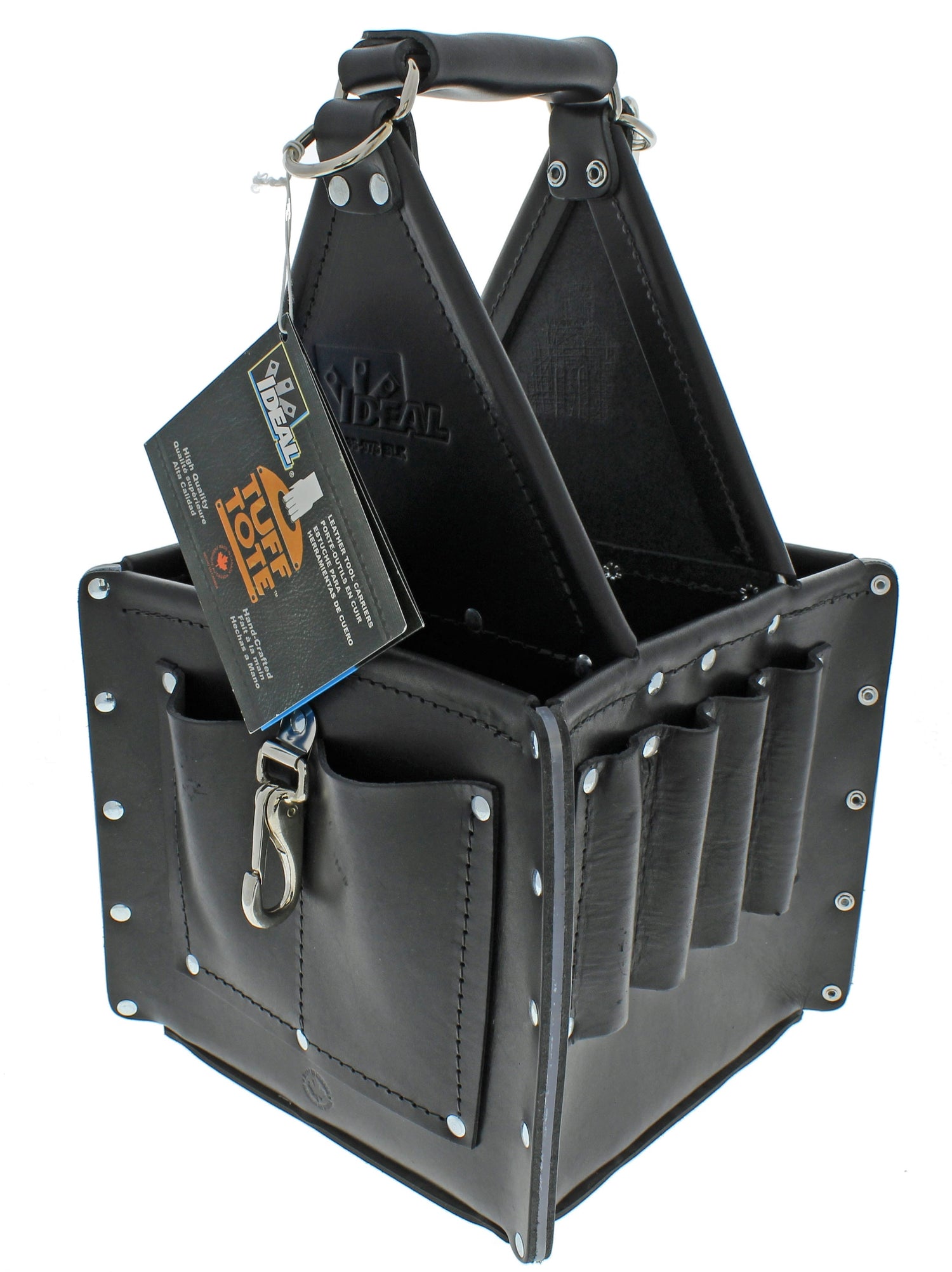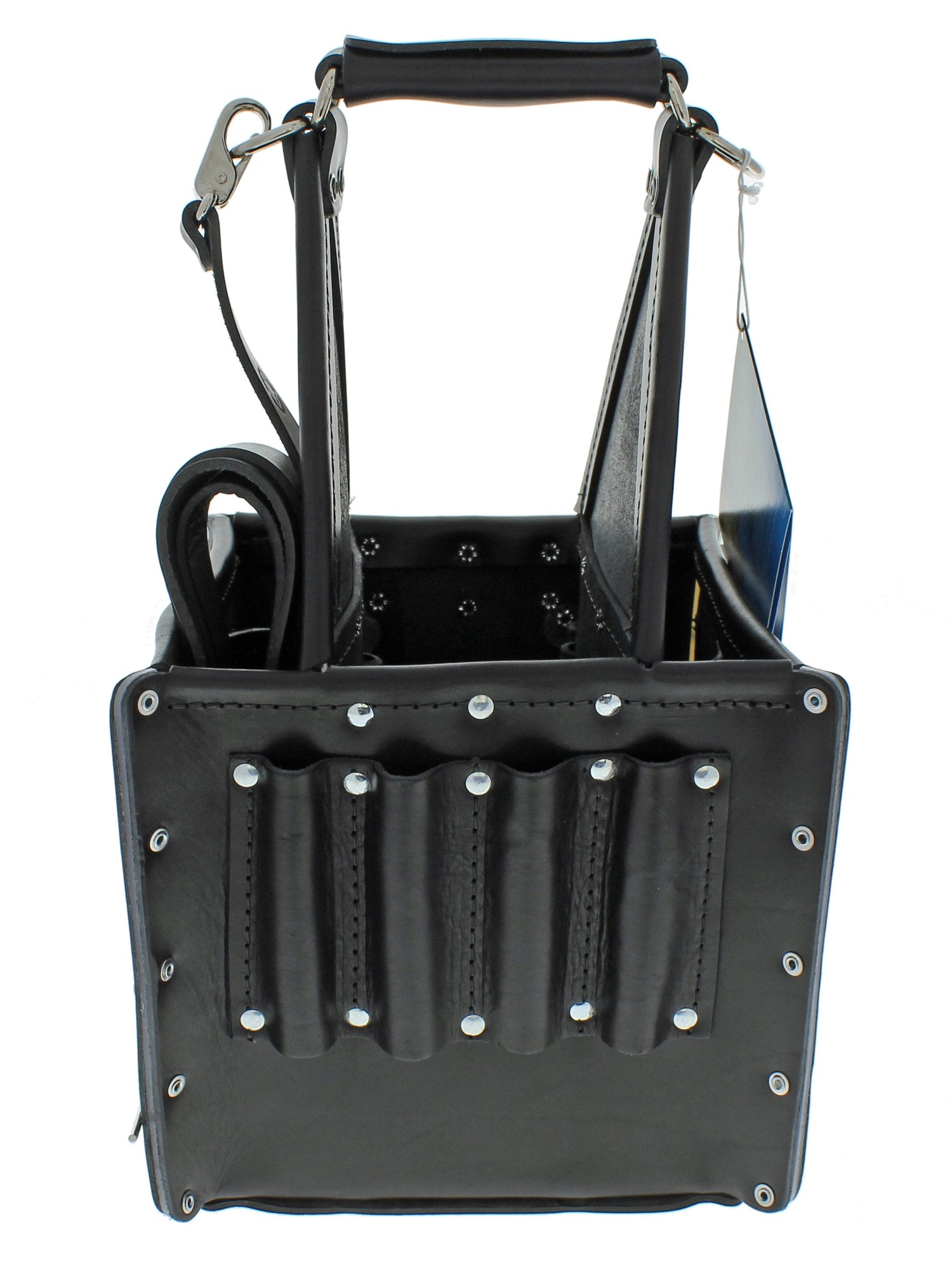 square tool carrier features 2 divided inside compartments with 6 screwdriver loops, 1 large center compartment, 4 outside pockets and 8 outside tool loops