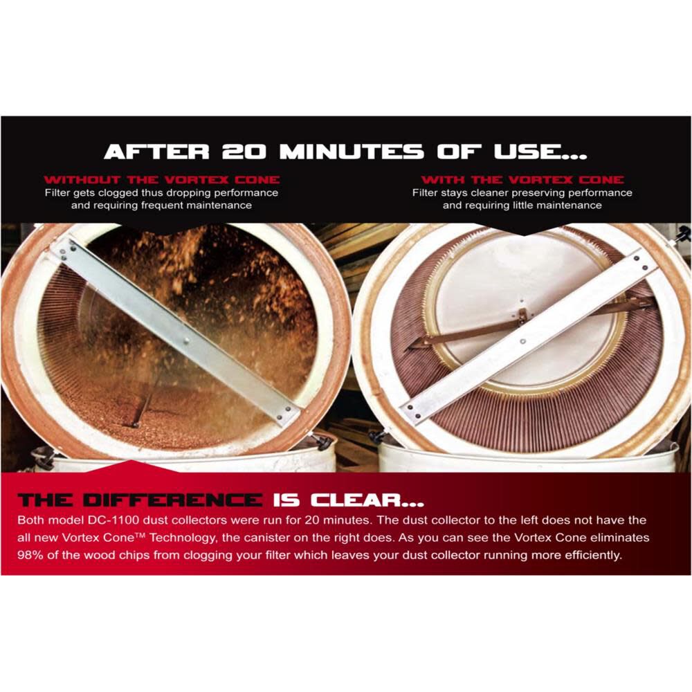 This JETÆ DC-1100VX-5M Dust Collector 1.5 HP, 1PH, 115/230V with 5-Micron Bag Filter Kit uses a specialized design to separate wood chips from dust particles.