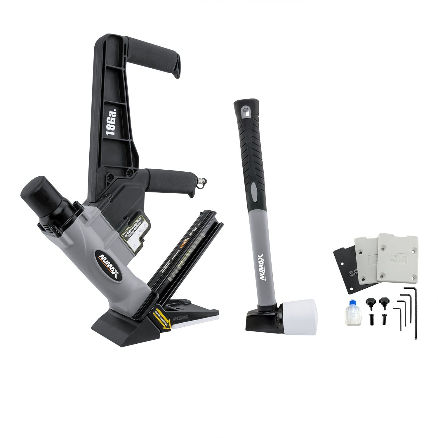 L-cleat dual handle flooring nailer includes a fiberglass mallet with a padded grip and rubber head, 3 interchangeable base plates, air tool oil and adjustment tools and is covered by Numax 1-year limited warranty and 30-day wearable parts warranty.