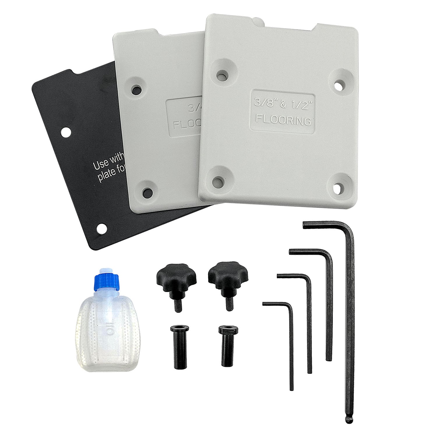 Interchangeable base plates 3 allow you to work on 3/8 in to 3/4 in flooring