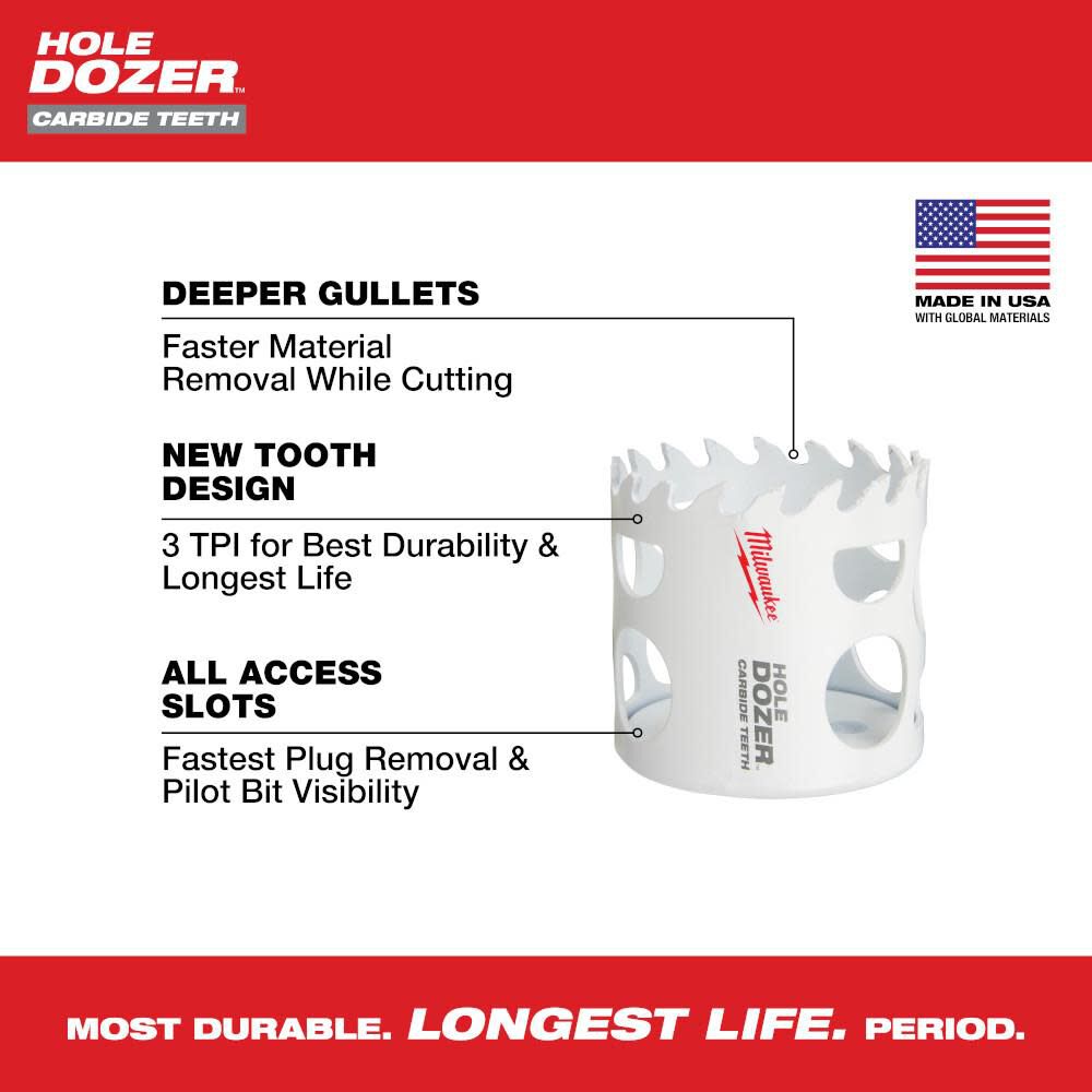 The MILWAUKEEÆ 1-5/16" HOLE DOZER with Carbide Teeth Hole Saw features a new 3 TPI design that offers fast cuts with the durability of a bi-metal hole saw and life of a carbide hole saw.