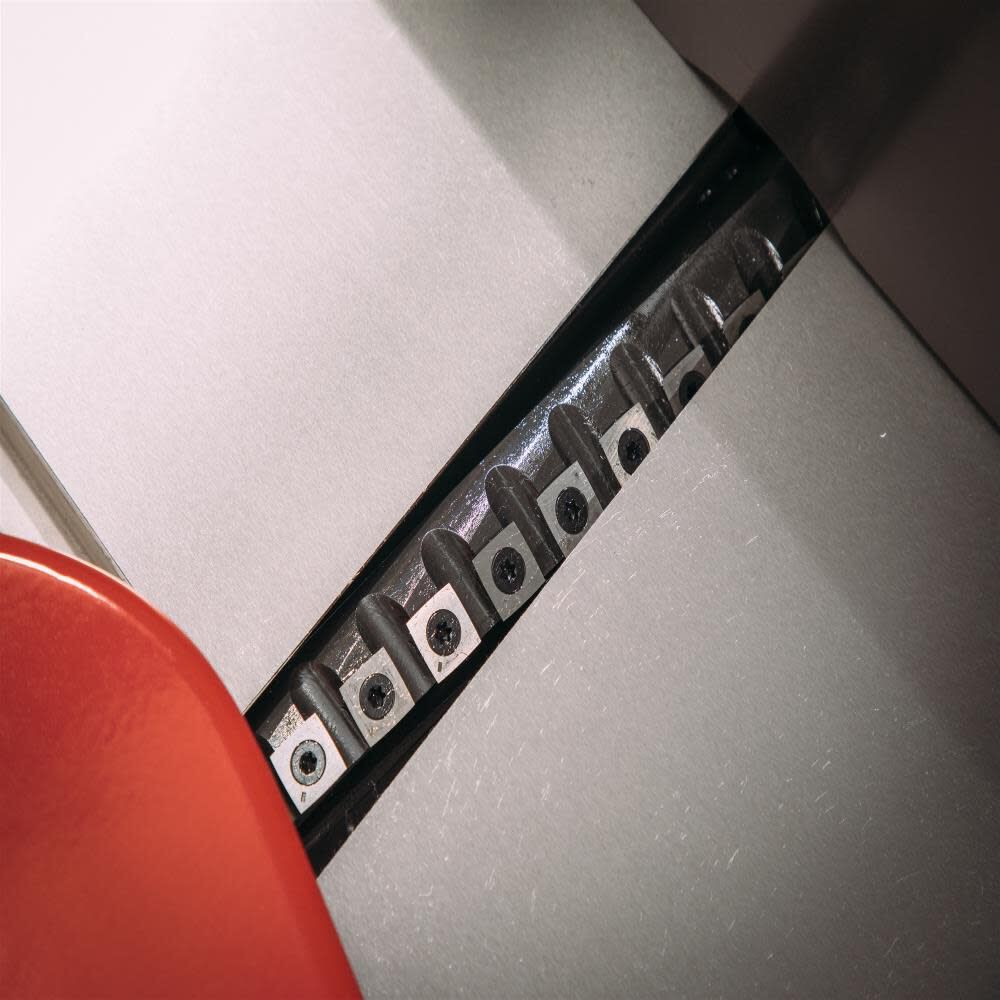 - Helical cutter head with indexable carbide inserts for a superior finish and quieter cut