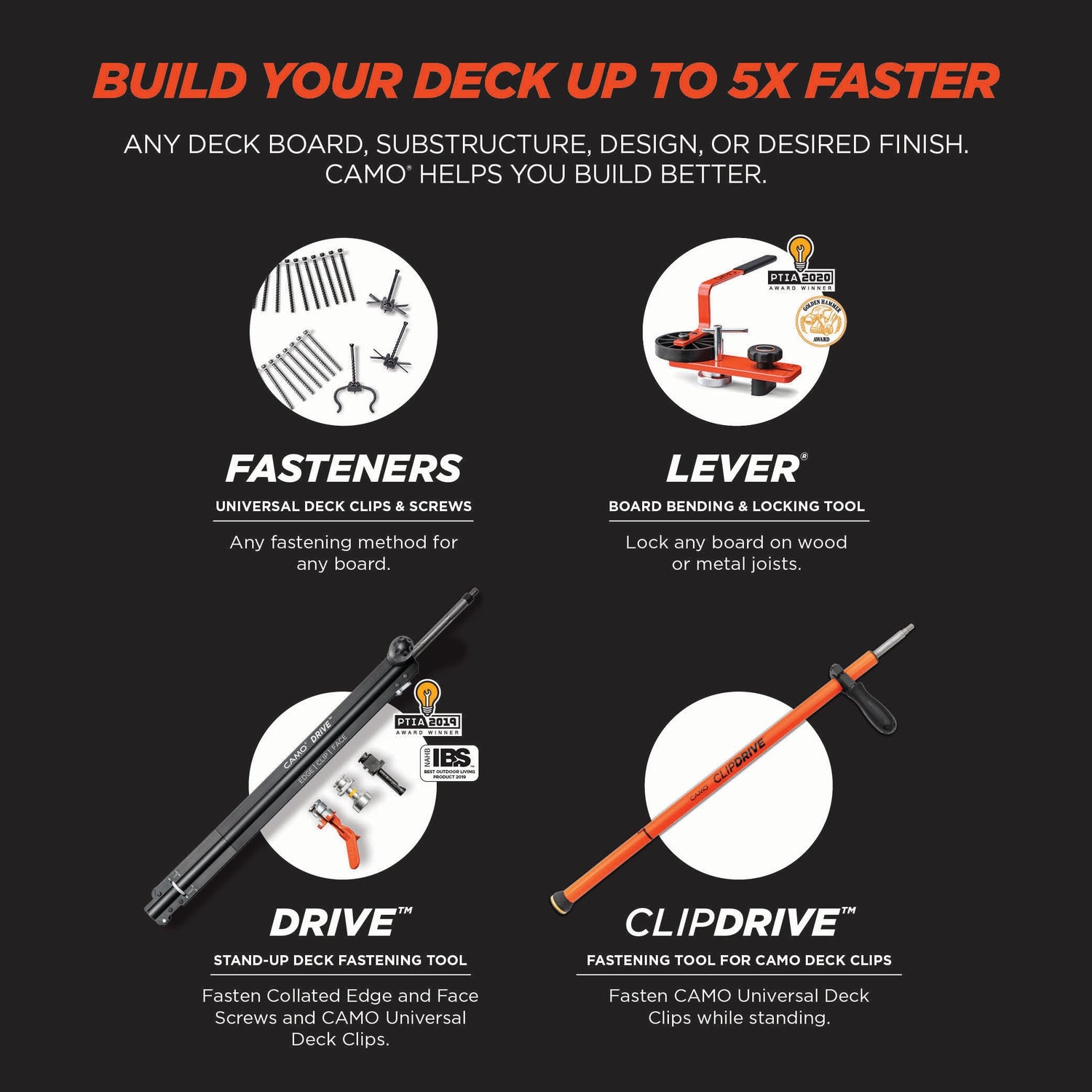 To build a better deck up to 5X faster, pair the Lever with CAMO’s innovative universal deck clips, collated fasteners, and the DRIVE stand-up tool.