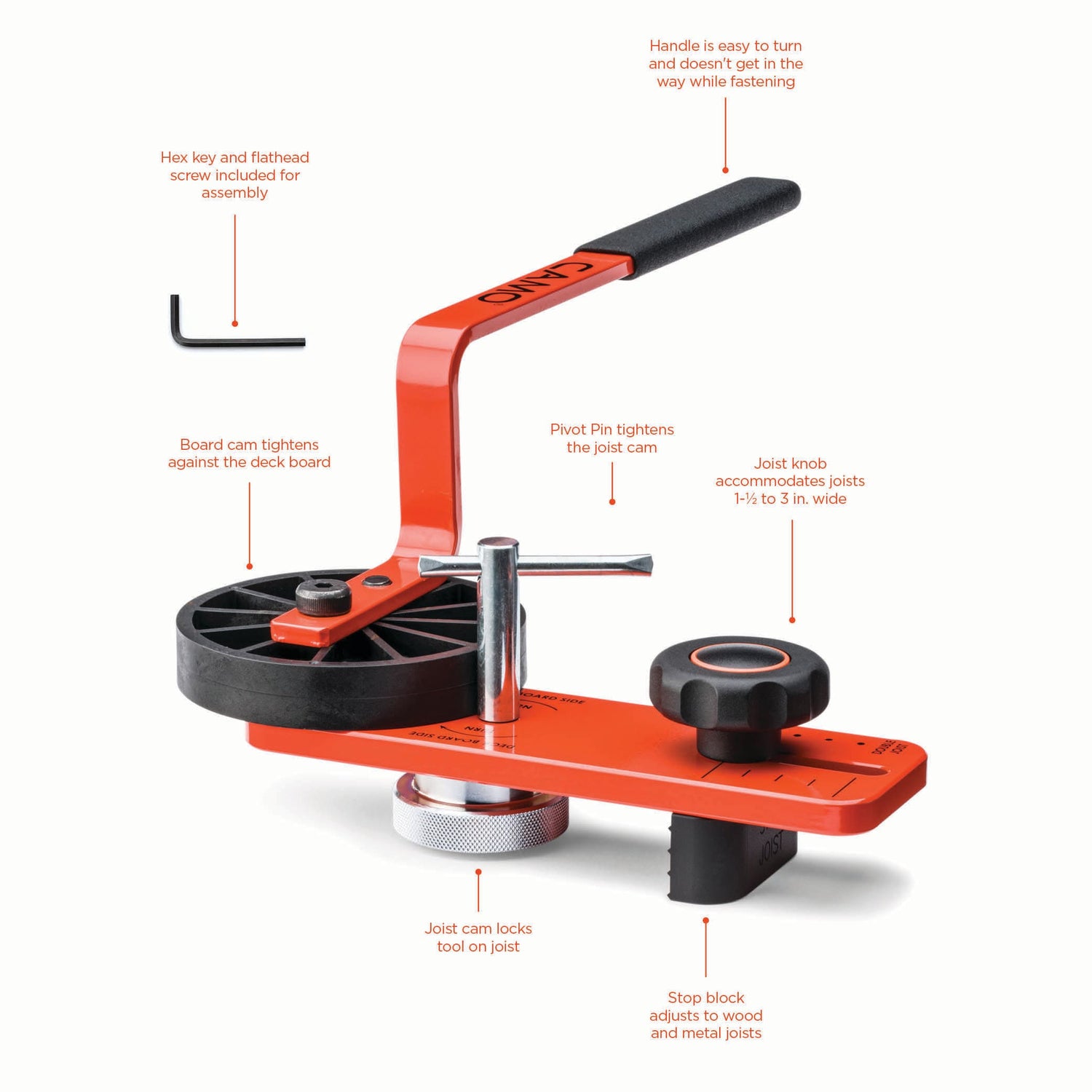 With one turn, CAMO LEVER can straighten warped boards and lock rows of boards and clips in place, while keeping spacing consistent.
