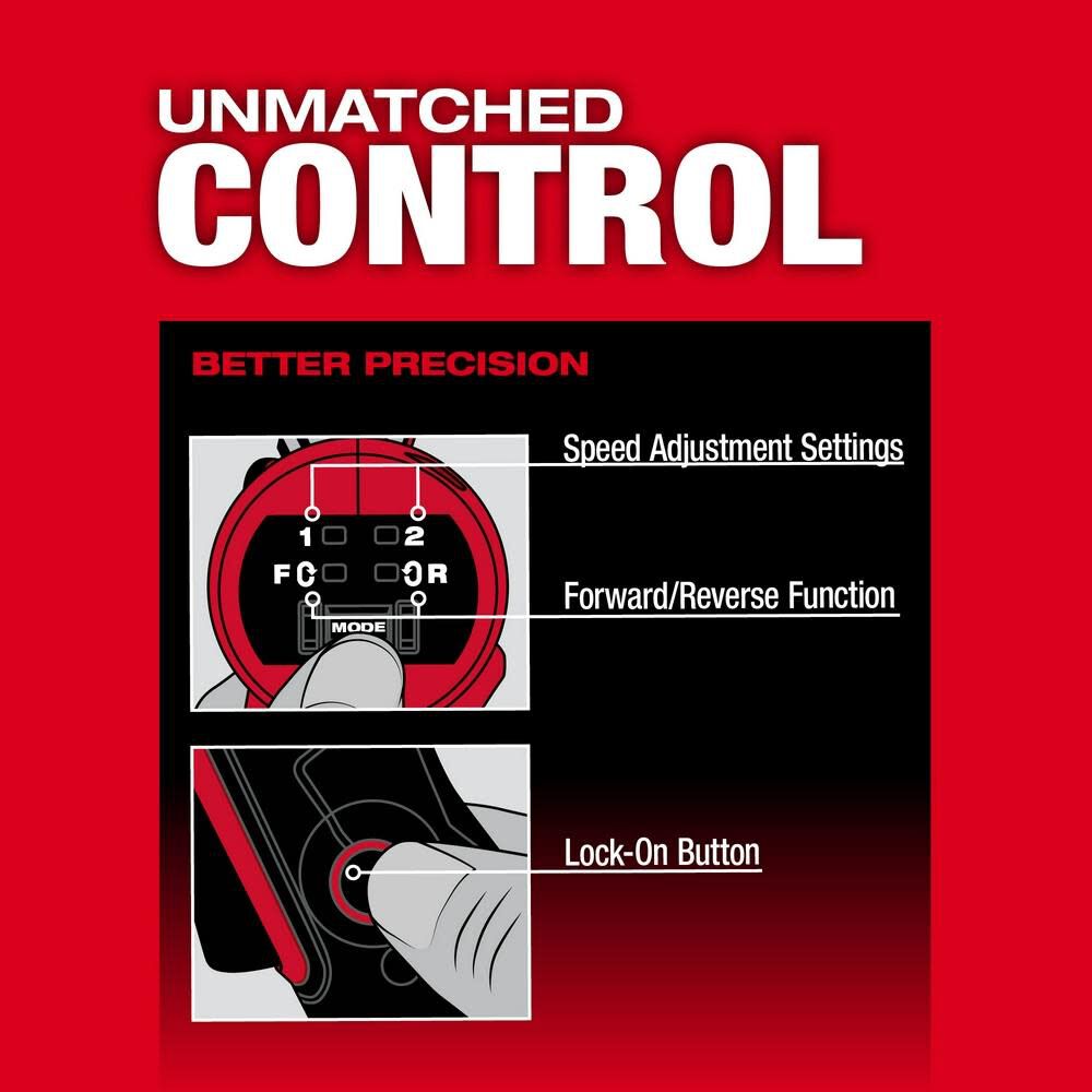 This MILWAUKEEÆ bandfile delivers UNMATCHED CONTROL with two-speed settings, Forward/Reverse function, a lock-on button, and a variable speed trigger.