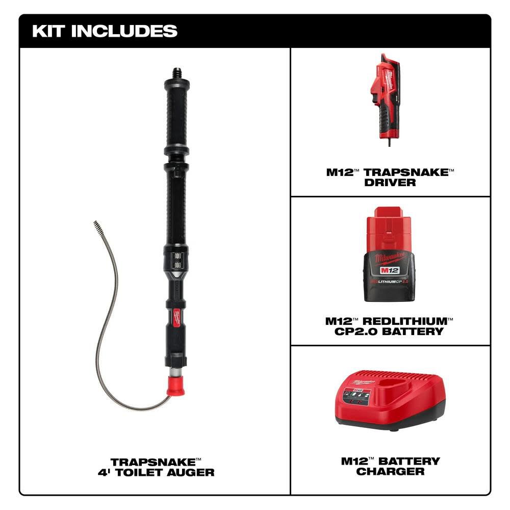 - Includes: (1) M12‚Ñ¢ TRAPSNAKE‚Ñ¢ 4 ft. Urinal Auger, (1) M12‚Ñ¢ TRAPSNAKE‚Ñ¢ Driver, (1) M12‚Ñ¢ REDLITHIUM‚Ñ¢ CP1.5 Battery Pack, M12‚Ñ¢ Charger