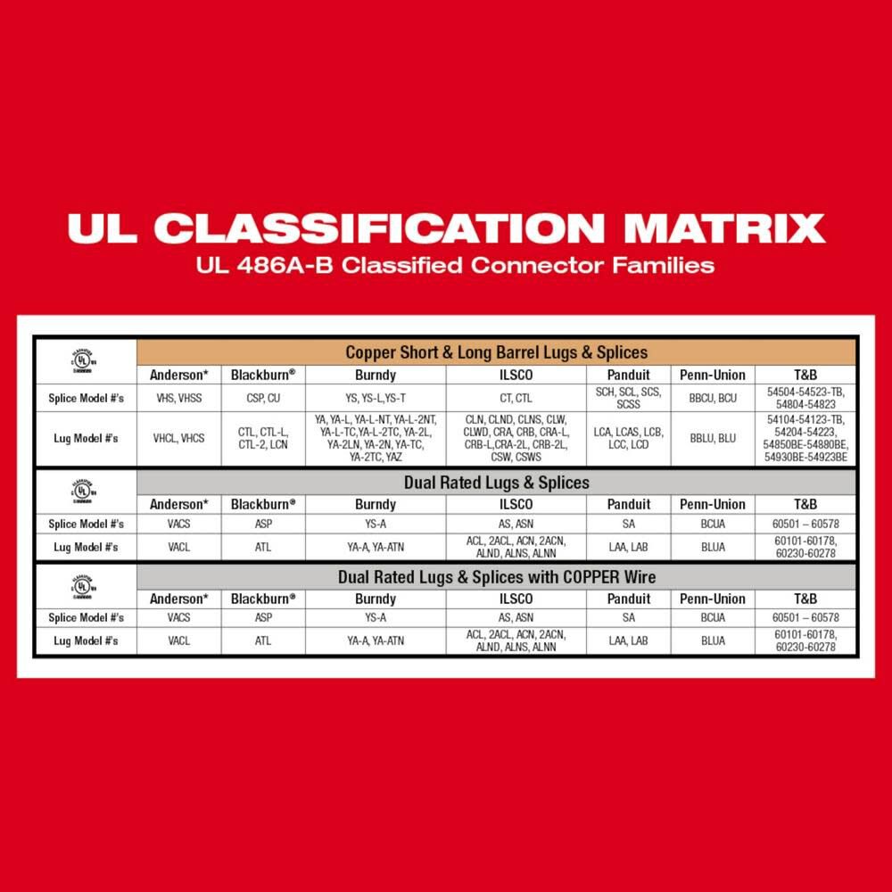 - Creates UL Classified crimps under UL 486A-B for #8 – 750 MCM Cu and Dual Rated lugs and splices across several leading manufacturers when used with corresponding Milwaukee® dies