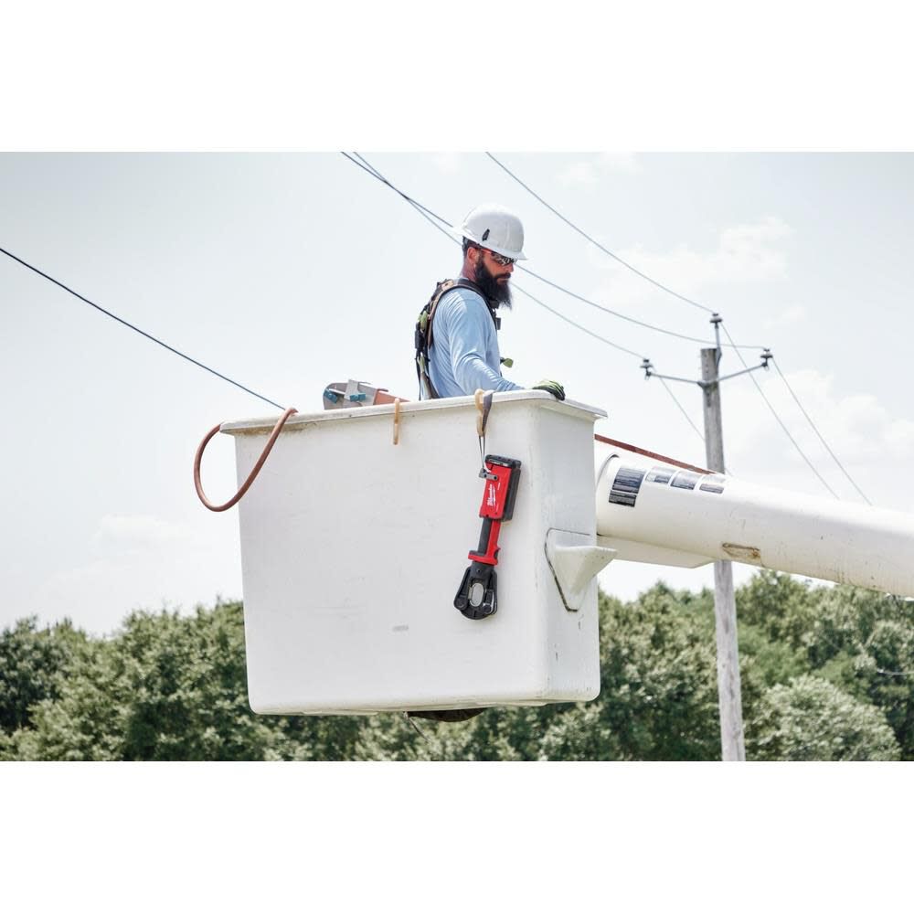 The Milwaukee crimper is designed to allow one-handed use in multiple orientations.