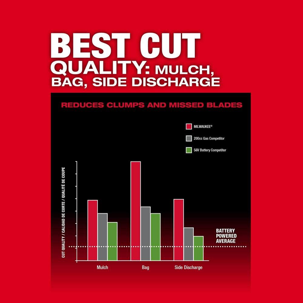 The optimized steel deck design paired with higher blade speed allows the battery-powered lawn mower to achieve superior airflow and increased lift to deliver the best cut quality in mulching, bagging, and side discharge applications.