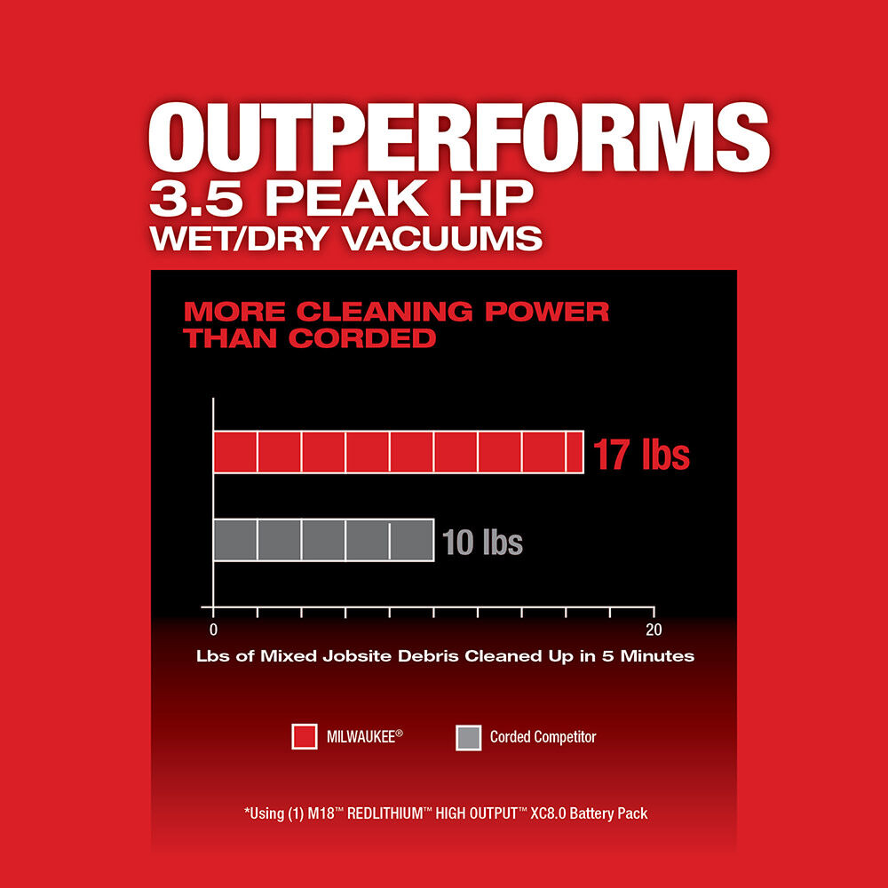The wet/dry vac cleans up more common jobsite debris like drywall dust, concrete dust, and wood/metal shavings than 3.5 peak HP wet/dry vacuums in the same amount of time.