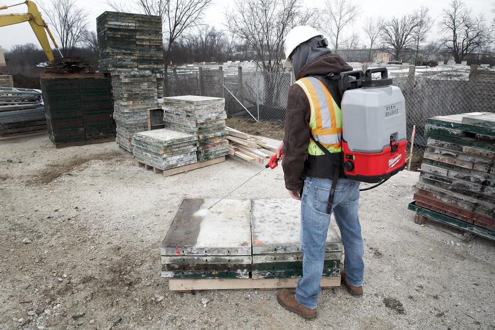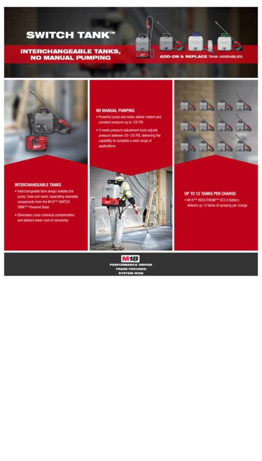 The MilwaukeeÆ M18 SWITCH TANK 4 Gallon backpack concrete sprayer kit is the industryÄôs first interchangeable tank design with no manual pumping.