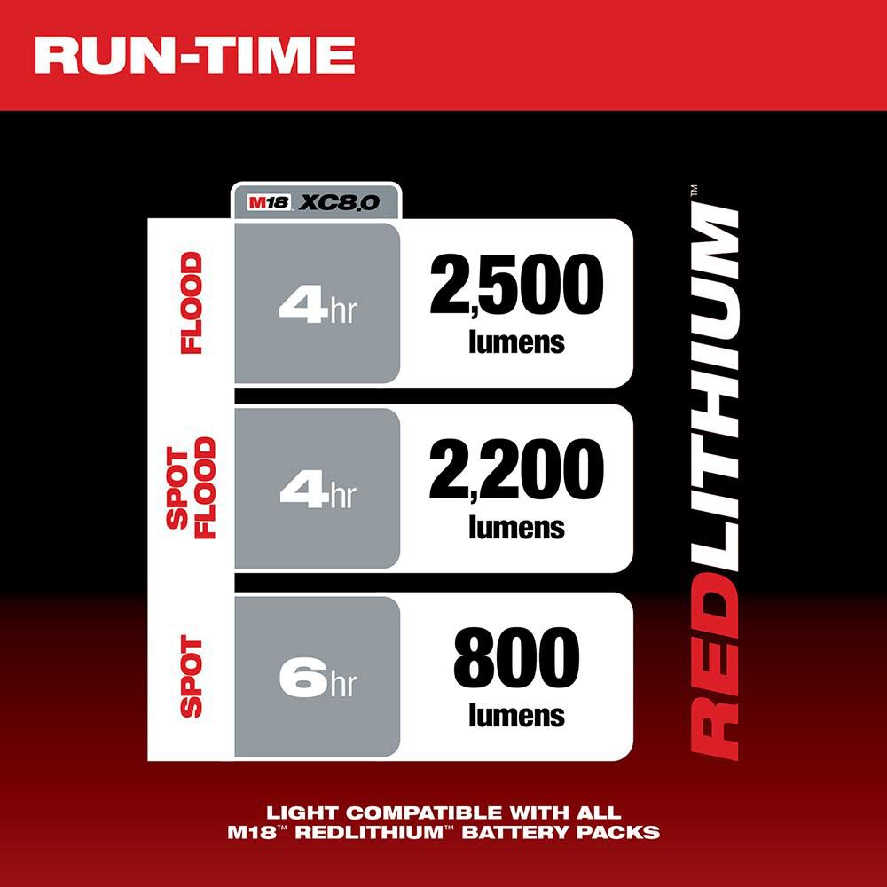 - Spot/flood mode: 4hrs with M18 REDLITHIUM high demand 9.0 battery pack