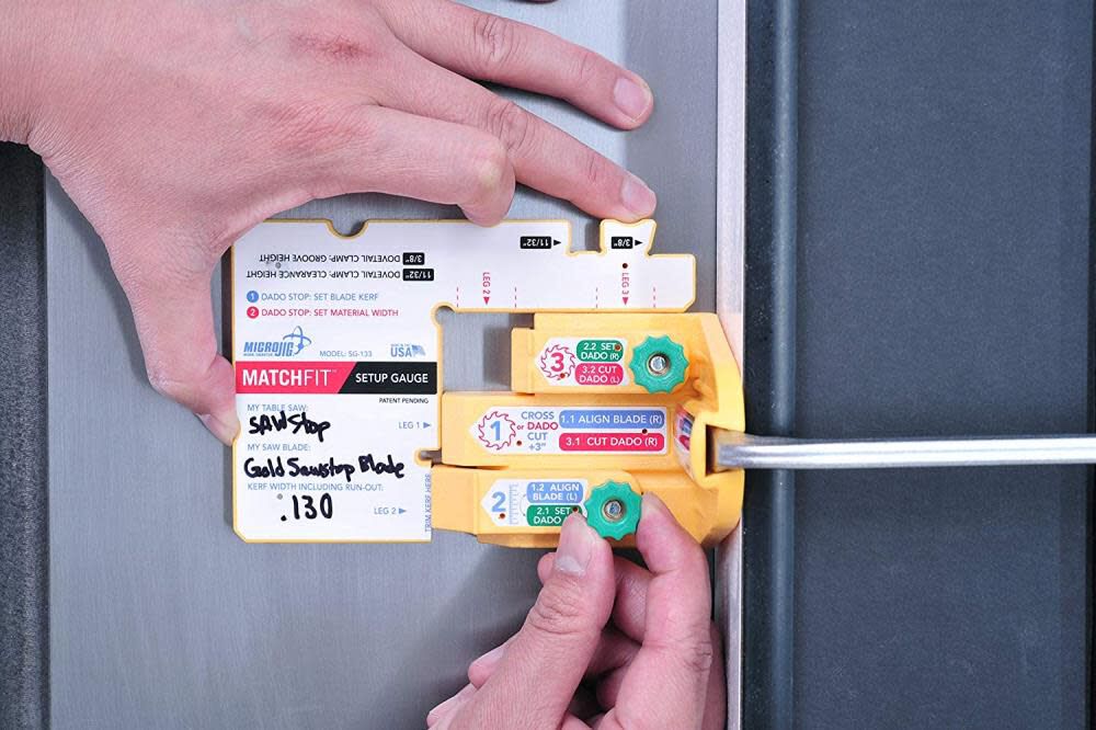 Even faster setup and additional accuracy for cutting dado in minutes with MATCHFIT dado stop | set the precise blade kerf with your own personal template that exactly matches your table saw kerf. | Setup gauge also allows you to square your inlay material and set the exact width of the dado cut. | No need for multiple test cuts, no cumbersome measuring, and no tricky setups | convenient router bit template letÄôs you set the exact 3/8Ä≥ depth for dovetail clamp grooves.