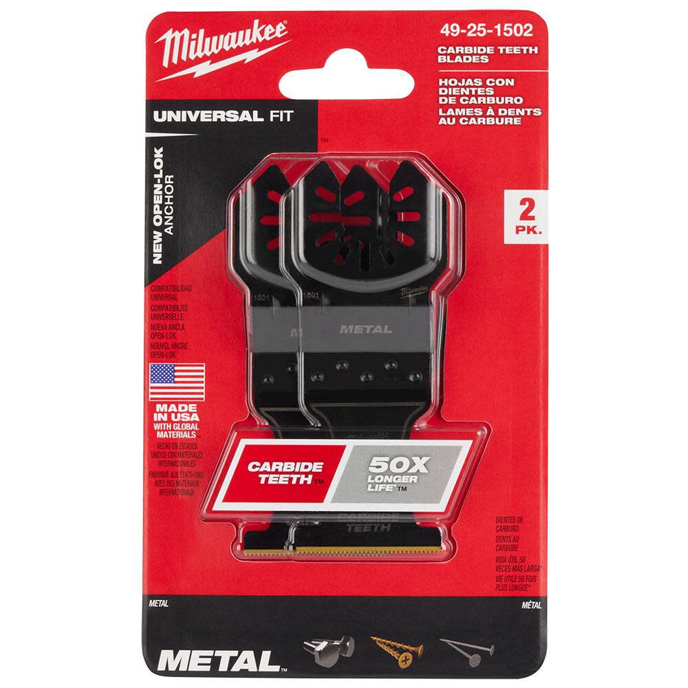 The MILWAUKEEÆ OPEN-LOK 1-3/8" Carbide Teeth Metal Oscillating Multi-Tool Blades are designed for metal cutting in screws, bolts, nails, and more.
