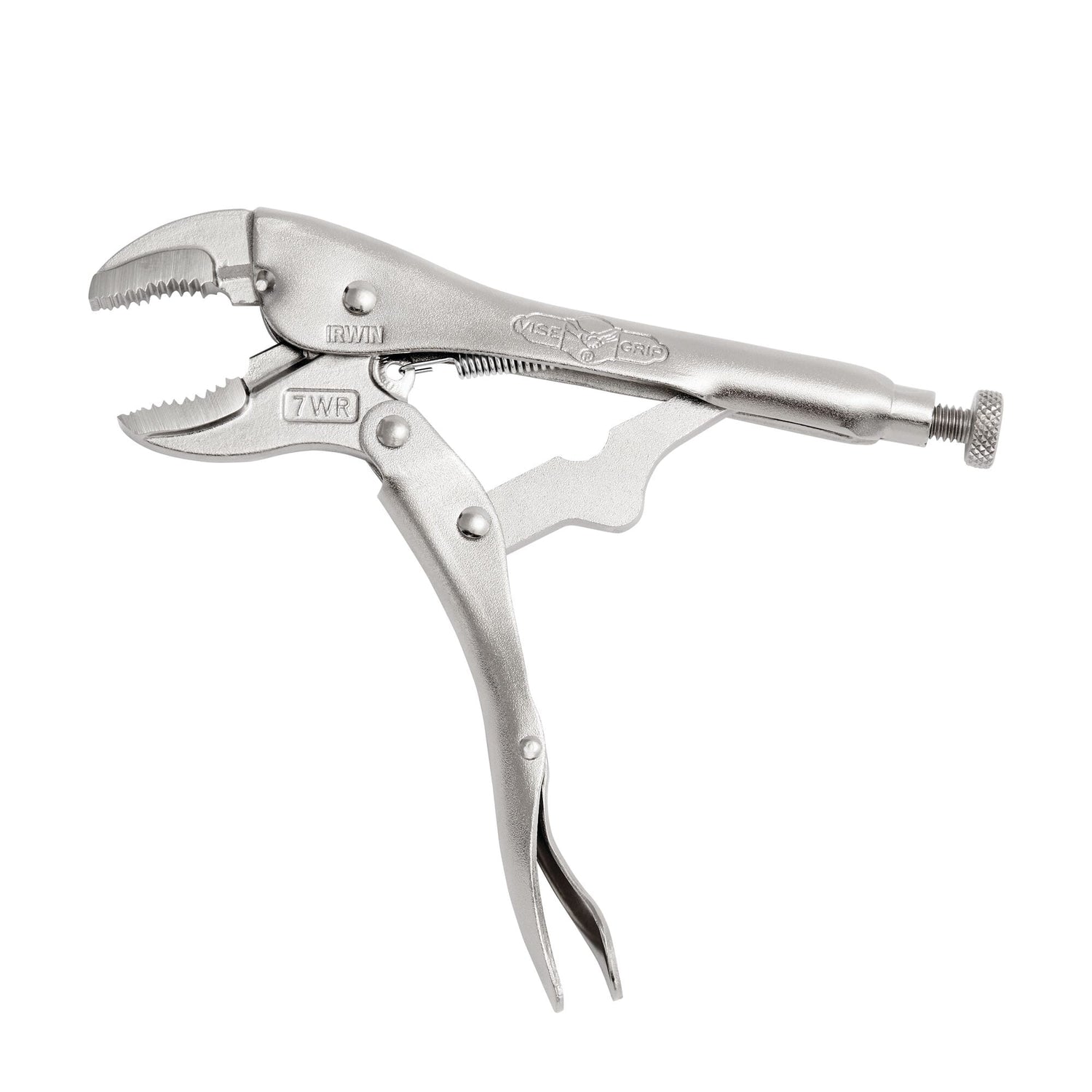 Curved jaw with built-in wire cutter great for a variety of applications and material shapes