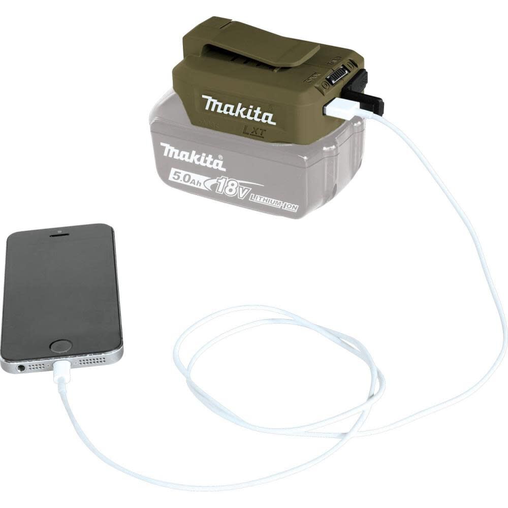The Makita Outdoor Adventure 18 Volt cordless power source allows the user to charge up to two USB compatible devices simultaneously.