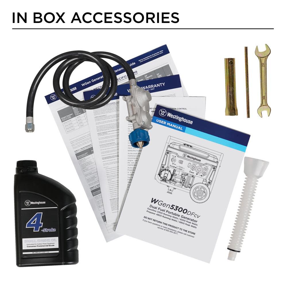 Package Contents - WGen5300DFcv, Oil Bottle, Oil Funnel, Spark Plug Wrench, Propane Regulator/Hose,Wheel Kit