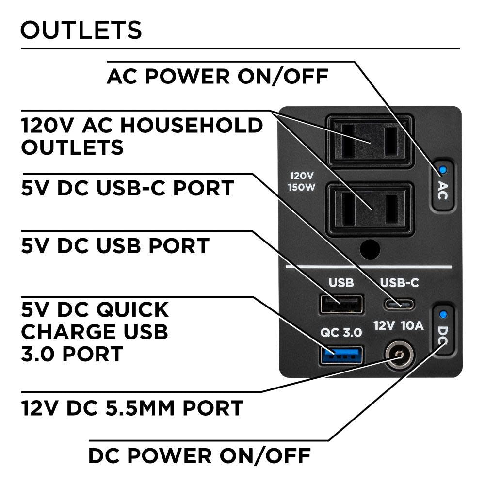- 194 Watt Hour, 150 running watts, and 300 peak watts; indoor/outdoor use